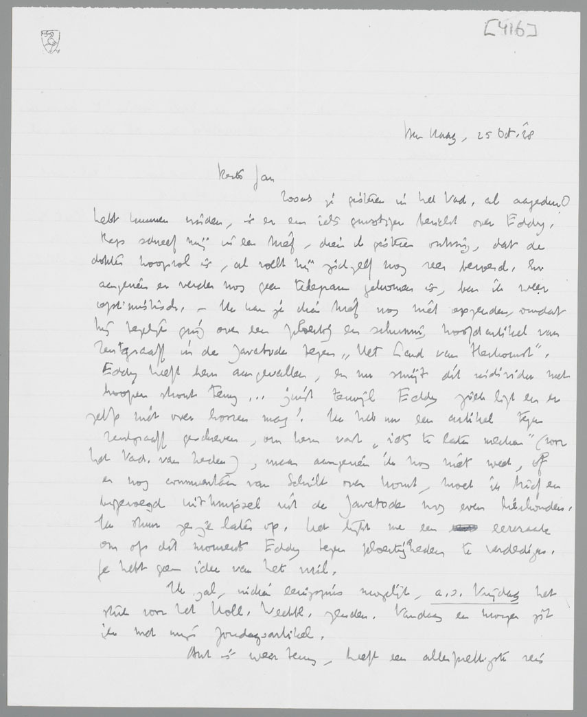Zooals je gisteren in het Vad. al aangeduid hebt kunnen vinden, is er een iets gunstiger bericht over Eddy. Bep schreef mij in een brief, dien ik gisteren ontving, dat de dokter hoopvol is, al voelt hij zichzelf nog zeer beroerd. En aangezien er verder nog geen telegram gekomen is, ben ik weer optimistisch. - Ik kan je dien brief nog niet opzenden, omdat hij tegelijk ging over een ploertig en schunnig hoofdartikel van Zentgraaff in de Javabode tegen ‘Het Land van Herkomst’. Eddy heeft hem aangevallen, en nu smijt dit individu met hoopen stront terug... juist terwijl Eddy ziek ligt en er zelfs niet eens over hooren mag! Ik heb nu een artikel tegen Zentgraaff geschreven, om hem vast ‘iets te laten merken’ (voor het Vad. van heden), maar aangezien ik nog niet weet, of er nog commentaar van Schilt over komt, moet ik brief en bijgevoegd uitknipsel uit de Javabode nog even hierhouden. Ik stuur ze je later op. Het lijkt me een eerezaak om op dit moment Eddy tegen ploertigheden te verdedigen. Je hebt geen idee van het vuil.