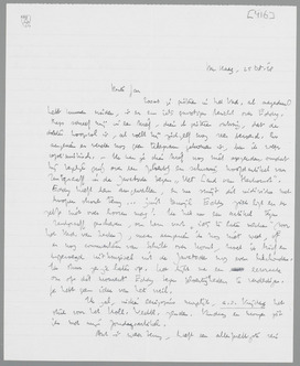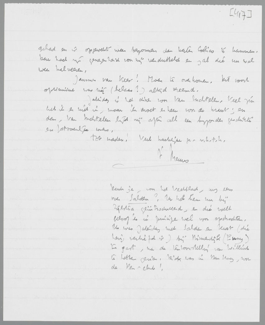 Denk je, voor het Weekblad, nog eens over Salden? Ik heb hem nu bij Zijlstra geïntroduceerd, en die voelt geloof ik in principe wel voor opdrachten. Ik was Zaterdag met Salden en Kurt (die hevig verliefd is) bij Binnendijk (Enny) te gast, na den tentoonstelling van Willink te hebben gezien. Dick was in Den Haag, voor de Pen-club!