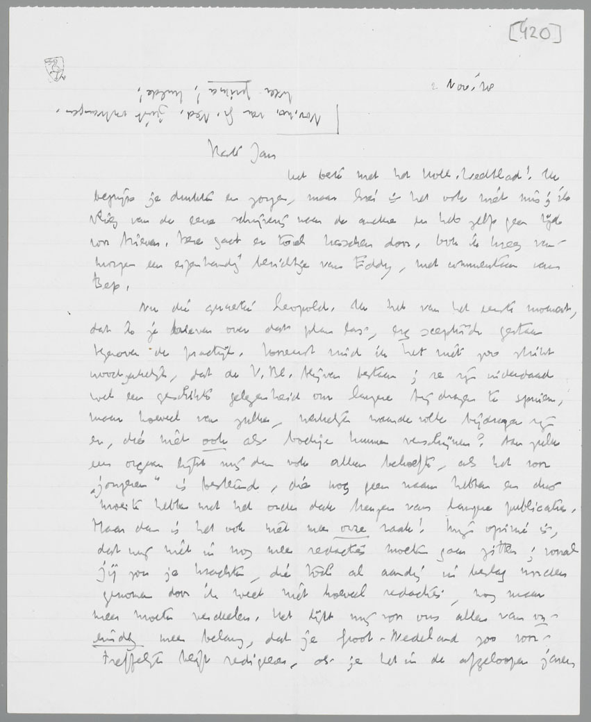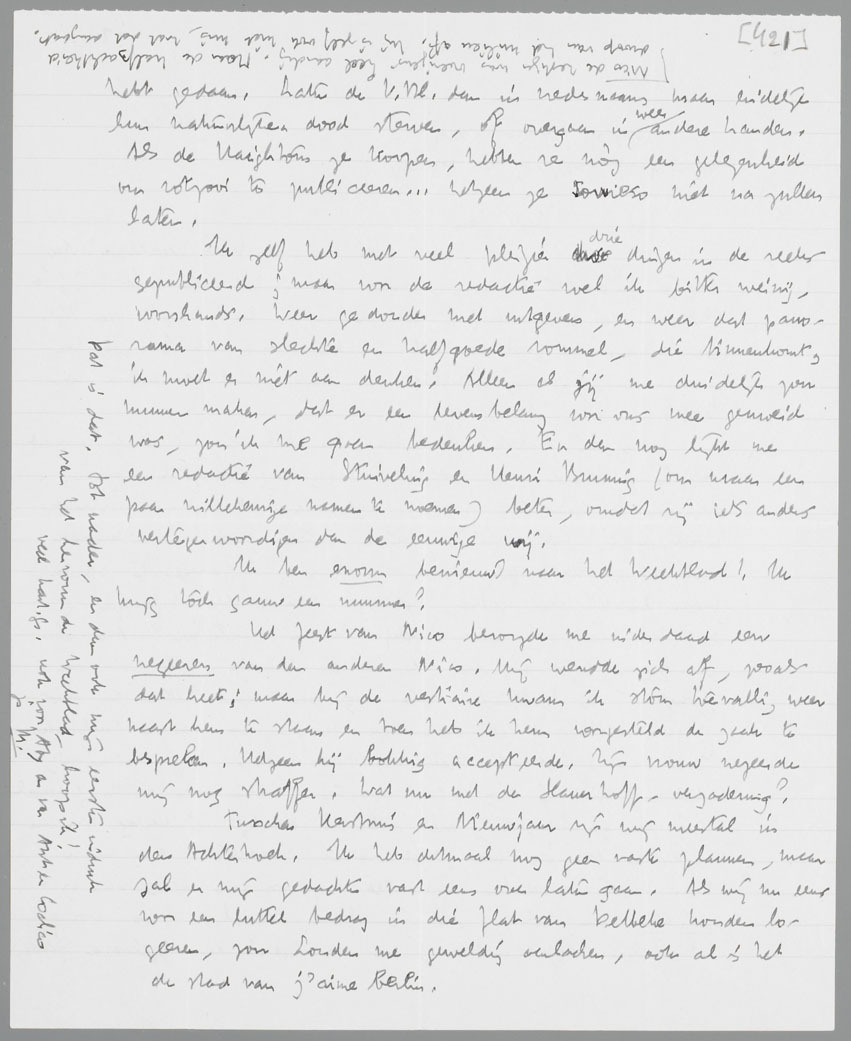 Nu die quaestie Leopold. Ik heb van het eerste moment, dat ik je brieven over dat plan las, erg sceptisch gestaan tegenover de practijk. Vooreerst vind ik het niet zoo strikt noodzakelijk, dat de V.Bl. blijven bestaan; ze zijn inderdaad wel een geschikte gelegenheid om langere bijdragen te spuien, maar hoeveel van zulke, werkelijk waardevolle bijdragen zijn er, die niet ook als boekje kunnen verschijnen? Aan zulk een orgaan lijkt mij dan ook alleen behoefte, als het voor ‘jongeren’ is bestemd, die nog geen naam hebben en dus moeite hebben met het onder dak brengen van langere publicaties. Maar dan is het ook niet meer onze zaak! Mijn opinie is, dat wij niet in nog meer redacties moeten gaan zitten; vooral jij zou je krachten, die toch al aardig in beslag worden genomen door ik weet niet hoeveel redacties, nog maar meer moeten verdeelen. Het lijkt mij voor ons allen van oneindig meer belang, dat je Groot-Nederland zoo voortreffelijk blijft redigeeren, als je het in de afgeloopen jaren hebt gedaan. Laten de V.Bl. dan in vredesnaam maar eindelijk hun natuurlijken dood sterven, of overgaan in weer andere handen. Als de Haightons ze koopen, hebben ze nòg een gelegenheid om rotzooi te publiceeren... hetgeen ze sowieso niet na zullen laten.