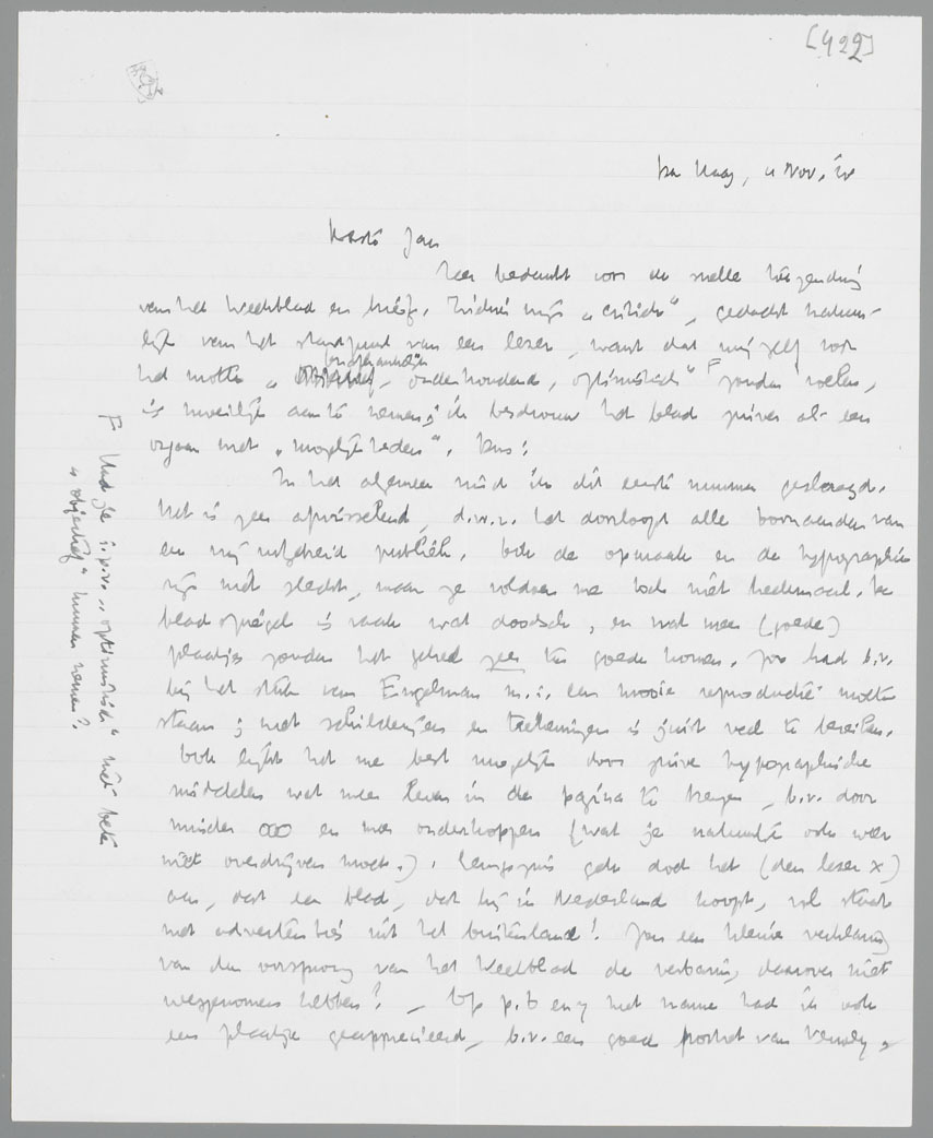 Dit zijn een paar bezwaren, die mij bij het doorlezen te binnen schoten. Maar ik heb respect voor de wijze, waarop je de reorganisatie hebt voltrokken. Zooals het nu is, kan het blad zeker al met de Groene concurreeren, al is de grondtoon dan wel wat al te blijmoedig - neutraal. Ik hoop, dat je op den duur wat meer naar ‘links’ kunt gaan, en wat meer strijdbaarheid toelaten; dat zal de levendigheid ook ten goede komen. Ik ben erg benieuwd naar de eerste resultaten van de kiosken en de abonné's.