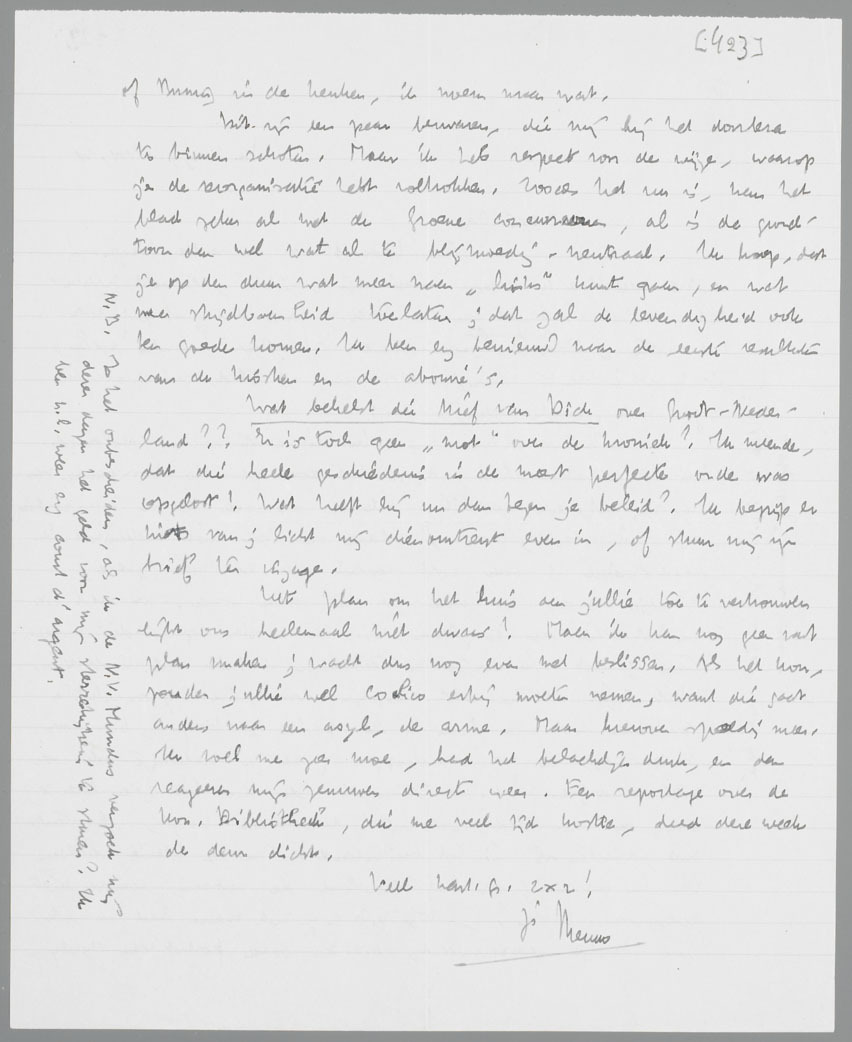 Wat behelst die brief van Dick over Groot-Nederland?? Er is toch geen ‘mot’ over de kroniek? Ik meende, dat die heele geschiedenis in de meest perfecte orde was opgelost! Wat heeft hij nu dan tegen je beleid? Ik begrijp er niets van; licht mij dienomtrent even in, of stuur mij zijn brief ter inzage.