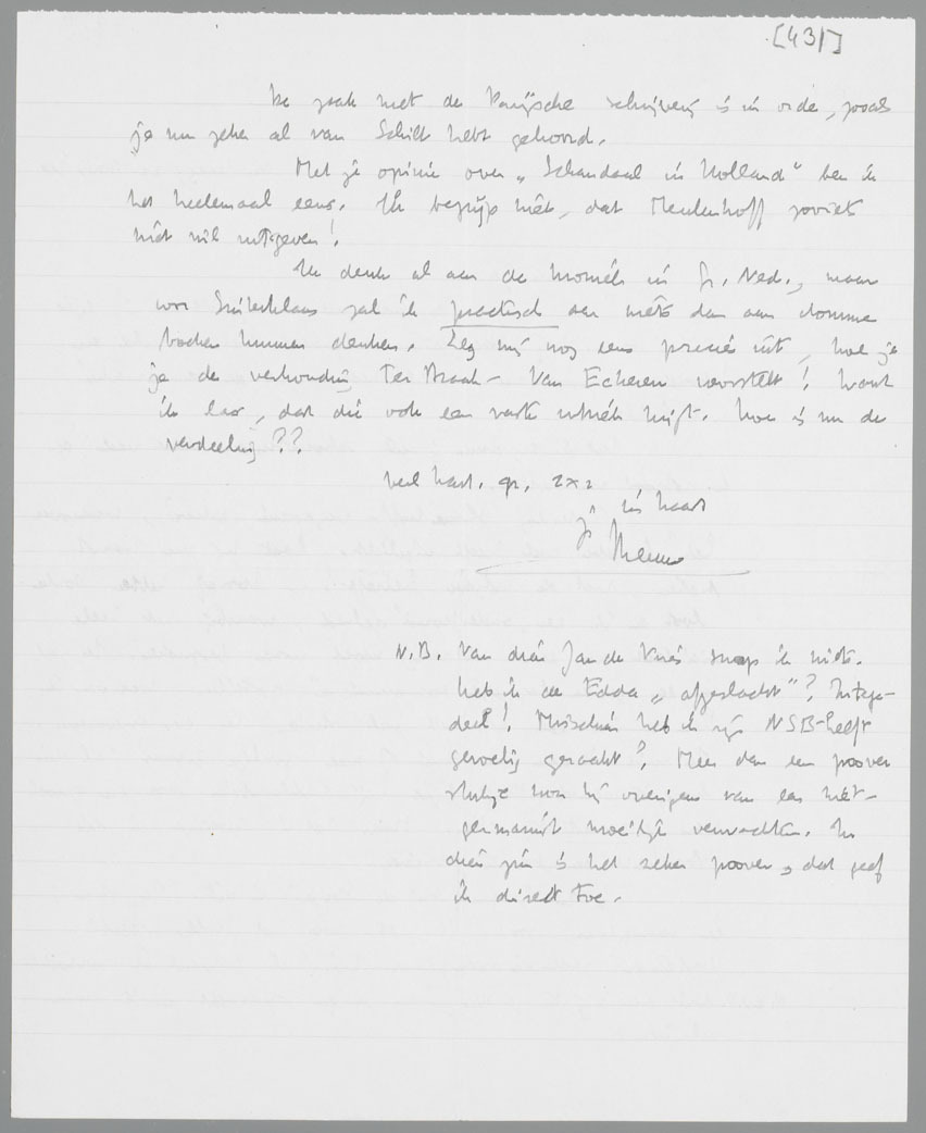 Zaterdag Slauerhoff-vergadering gehad, waarover Lek je zeker wel heeft ingelicht. Laat hij nu haast maken, wat de uitgave betreft! - Vooraf hebben Donkersloot en ik een ‘onderhoud’ gehad, waarbij het heele incident nog eens uitvoerig moest worden besproken. Ik zal nu een gemeenschappelijk communiqué opstellen, waarvan ik hem en jou een afschrift zal sturen ter ev. amendeering. Ik vind Donker een min of meer zielige figuur; al die hoog te paard zitterij lijkt mij verklaarbaar door een gevoel van er naast te zitten. Maar het is moeilijk in die starheid een bres te schieten.