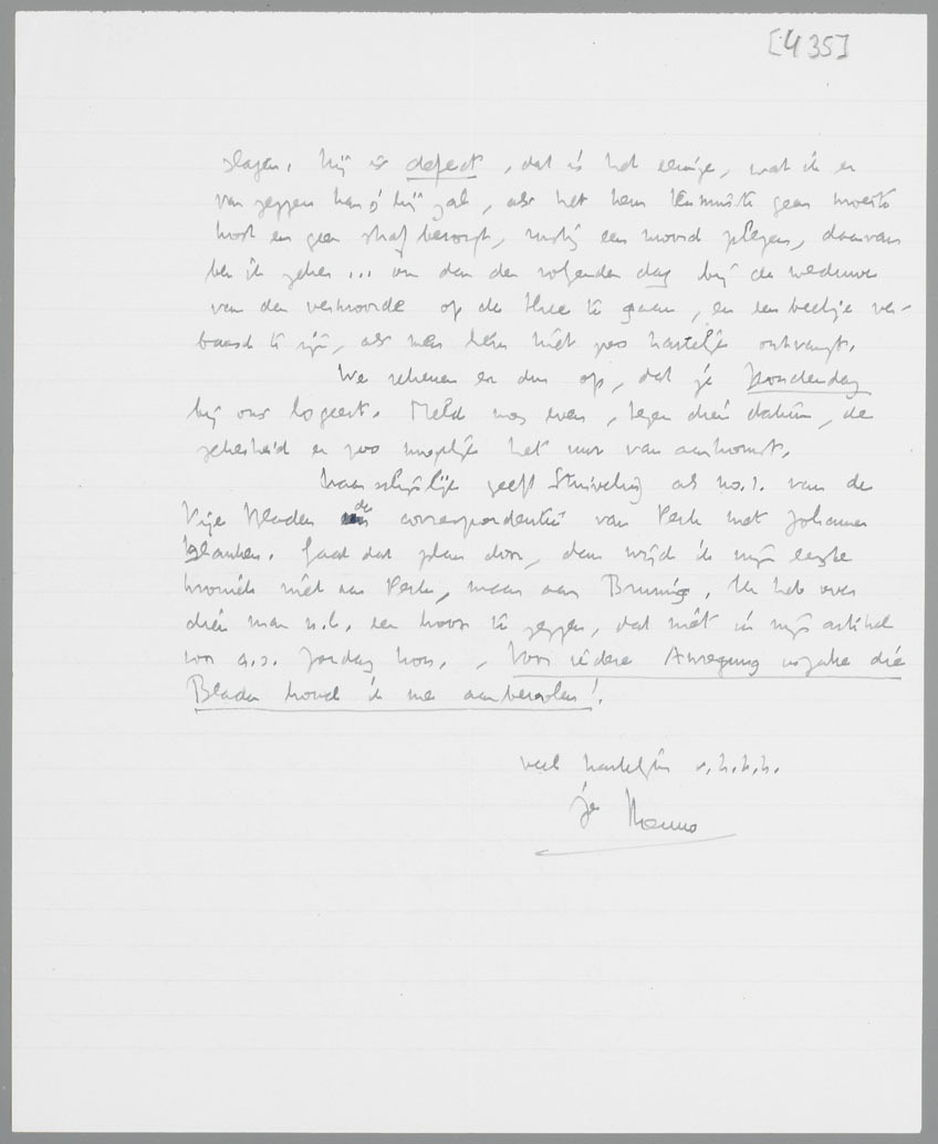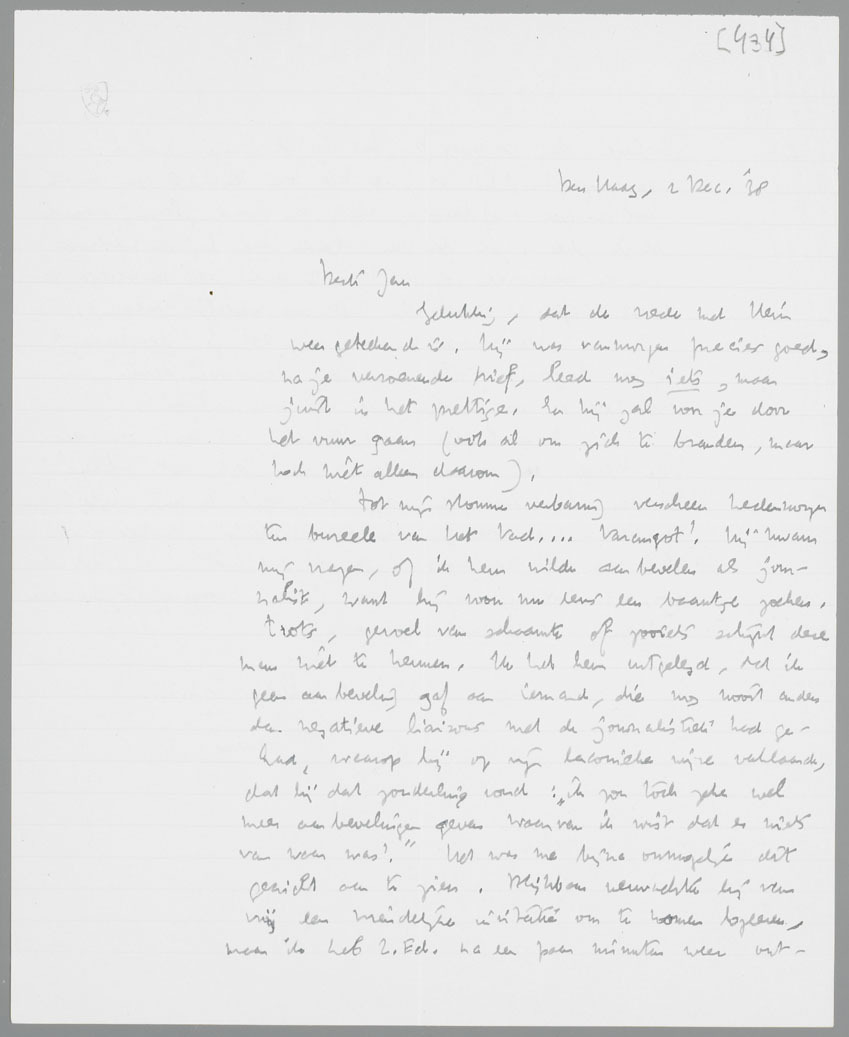 Waarschijnlijk geeft Stuiveling als no.1. van de Vrije Bladen de correspondentie van Perk met Johannes Blanken. Gaat dat plan door, dan wijd ik mijn eerste kroniek niet aan Perk, maar aan Bruning. Ik heb over dien man n.l. een hoop te zeggen, dat niet in mijn artikel voor a.s. Zondag kon. - Voor iedere Anregung inzake die Bladen houd ik me aanbevolen!