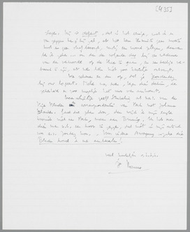 Gelukkig, dat de vrede met Hein weer geteekend is. Hij was vanmorgen precies goed, na je verzoenende brief, leed nog iets, maar juist in het prettige. En hij zal voor je door het vuur gaan (ook al om zich te branden, maar toch niet alleen daarom).