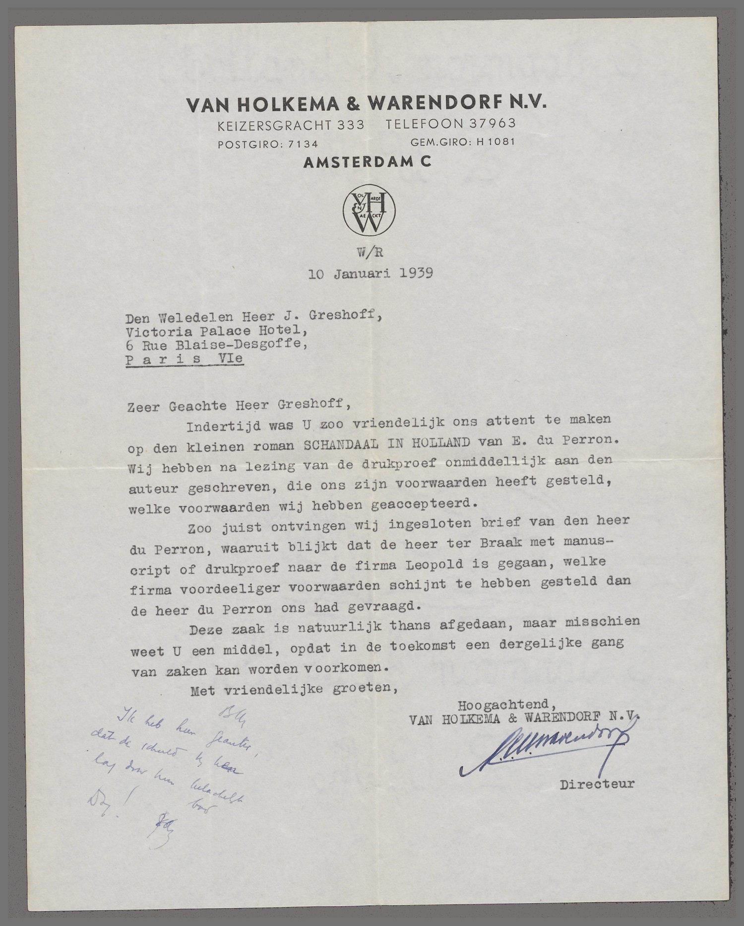 Origineel: particuliere collectie. [brief geschreven op de brief van Holkema & Warendorf aan Jan Greshoff van 10 januari 1939]