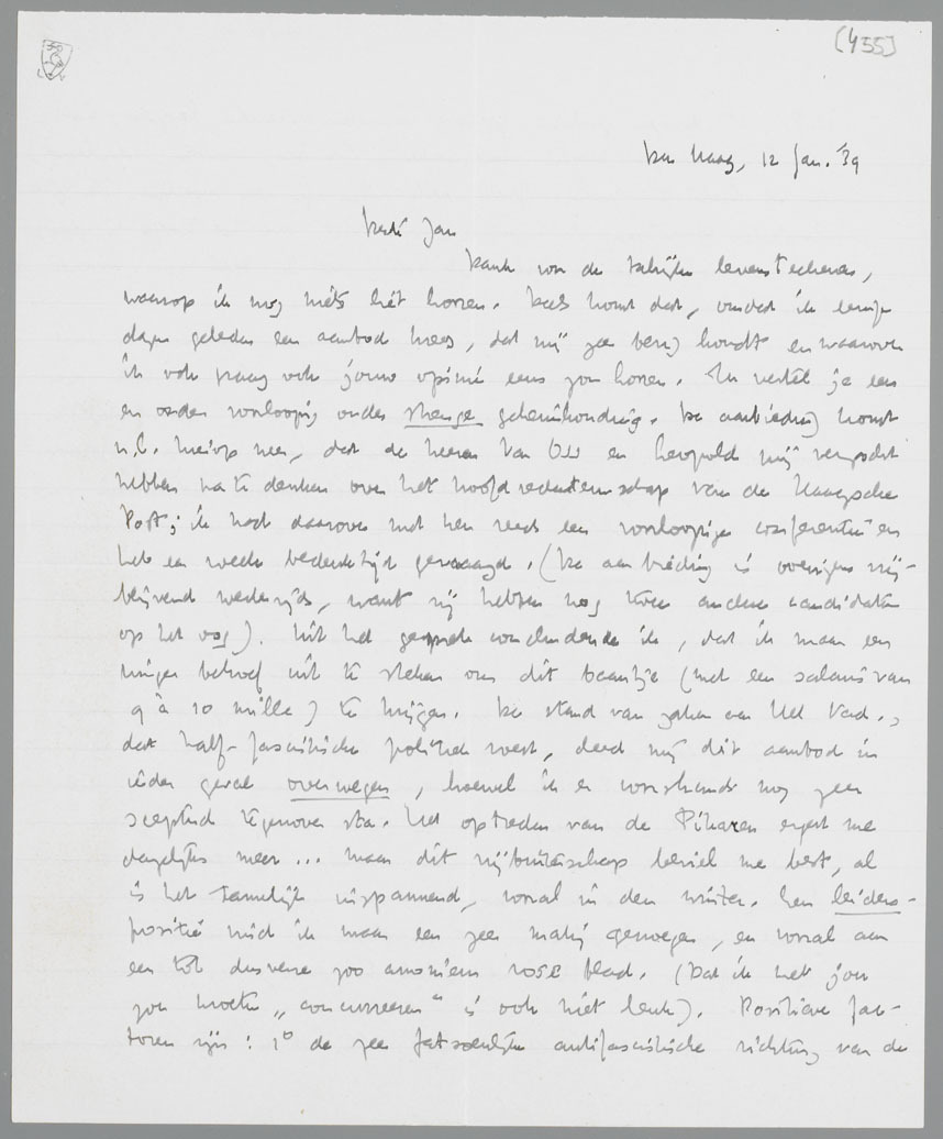 Dank voor de talrijke levensteekenen, waarop ik nog niets liet hooren. Deels komt dat, omdat ik eenige dagen geleden een aanbod kreeg, dat mij zeer bezig houdt en waarover ik ook graag jouw opinie eens zou hooren. Ik vertel je een en ander voorloopig onder strenge geheimhouding. De aanbieding komt n.l. hierop neer, dat de heeren Van Oss en Leopold mij verzocht hebben na te denken over het hoofdredacteurschap van de Haagsche Post; ik had daarover met hen reeds een voorloopige conferentie en heb een week bedenktijd gevraagd. (De aanbieding is overigens vrijblijvend wederzijds, want zij hebben nog twee andere candidaten op het oog). Uit het gesprek concludeerde ik, dat ik maar een vinger behoef uit te steken om dit baantje (met een salaris van 9 à 10 mille) te krijgen. De stand van zaken aan Het Vad., dat half-fascistische politiek voert, deed mij dit aanbod in ieder geval overwegen, hoewel ik er voorshands nog zeer sceptisch tegenover sta. Het optreden van de Pikaren ergert me dagelijks meer... maar dit vrijbuiterschap beviel me best, al is het tamelijk inspannend, vooral in den winter. Een leiders positie vind ik maar een zeer matig genoegen, en vooral aan een tot dusverre zoo anoniem rose blad. (Dat ik met jou zou moeten ‘concurreeren’ is ook niet leuk). Positieve factoren zijn: 1o de zeer fatsoenlijke antifascistische richting van de H.P., 2o de zeer geschikte persoon van den directeur Leopold, met wien ik nauw zou moeten samenwerken. Ik ben, kortom, verscheurd, om met Coster te spreken. Zulke beslissingen zijn zeer moeilijk. De financieele vooruitgang is natuurlijk ook niet over het hoofd te zien, maar daarvoor doe ik toch niet iets, dat ik beter zou kunnen laten. Adviseer mij eens!