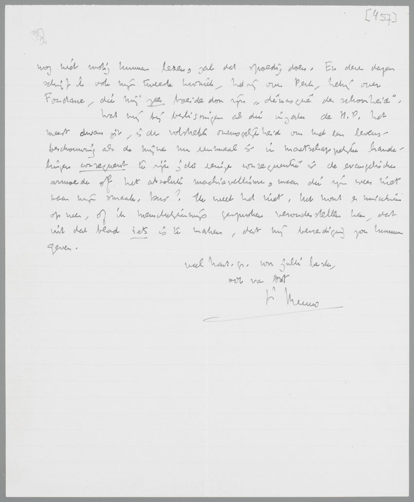 Wat mij bij beslissingen als die inzake de H.P. het meest dwars zit, is de volstrekte onmogelijkheid om met een levensbeschouwing als de mijne nu eenmaal is in maatschappelijke handelingen consequent te zijn; de eenige consequentie is de evangelischen armoede of het absolute machiavellisme, maar die zijn weer niet naar mijn smaak. Dus? Ik weet het niet. Het komt er misschien op neer, of ik menschelijkerwijs gesproken veronderstellen kan, dat uit dat blad iets is te maken, dat mij bevrediging zou kunnen geven.