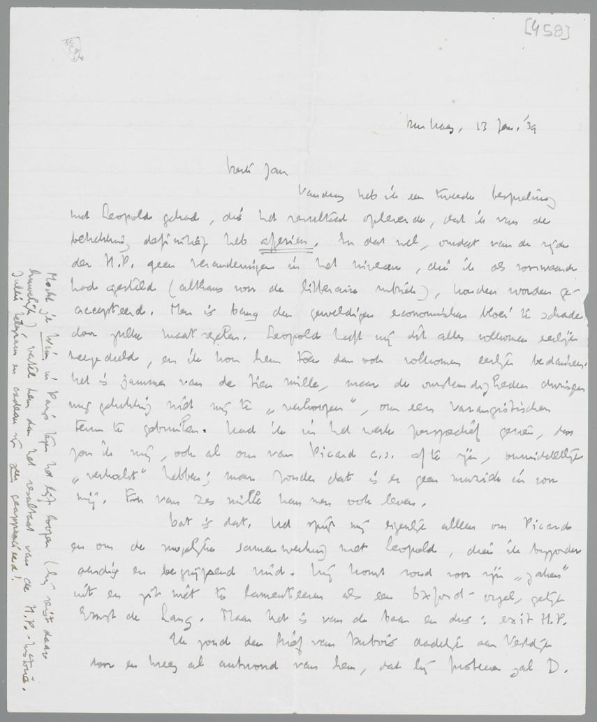 Vandaag heb ik een tweede bespreking met Leopold gehad, die het resultaat opleverde, dat ik van de betrekking definitief heb afgezien. En dat wel, omdat van de zijde der H.P. geen veranderingen in het niveau, die ik als voorwaarde had gesteld (althans voor de litteraire rubriek), konden worden geaccepteerd. Men is bang den geweldigen economischen bloei te schaden door zulke maatregelen. Leopold heeft mij dit alles volkomen eerlijk meegedeeld, en ik kon hem toen dan ook volkomen eerlijk bedanken. Het is jammer van de tien mille, maar de omstandigheden dwingen mij gelukkig niet mij te ‘verkoopen’, om een Varangistischen term te gebruiken. Had ik in het werk perspectief gezien, dan zou ik mij, ook al om van Picard c.s. af te zijn, onmiddellijk ‘verkocht’ hebben; maar zonder dat is er geen muziek in voor mij. En van zes mille kan men ook leven.