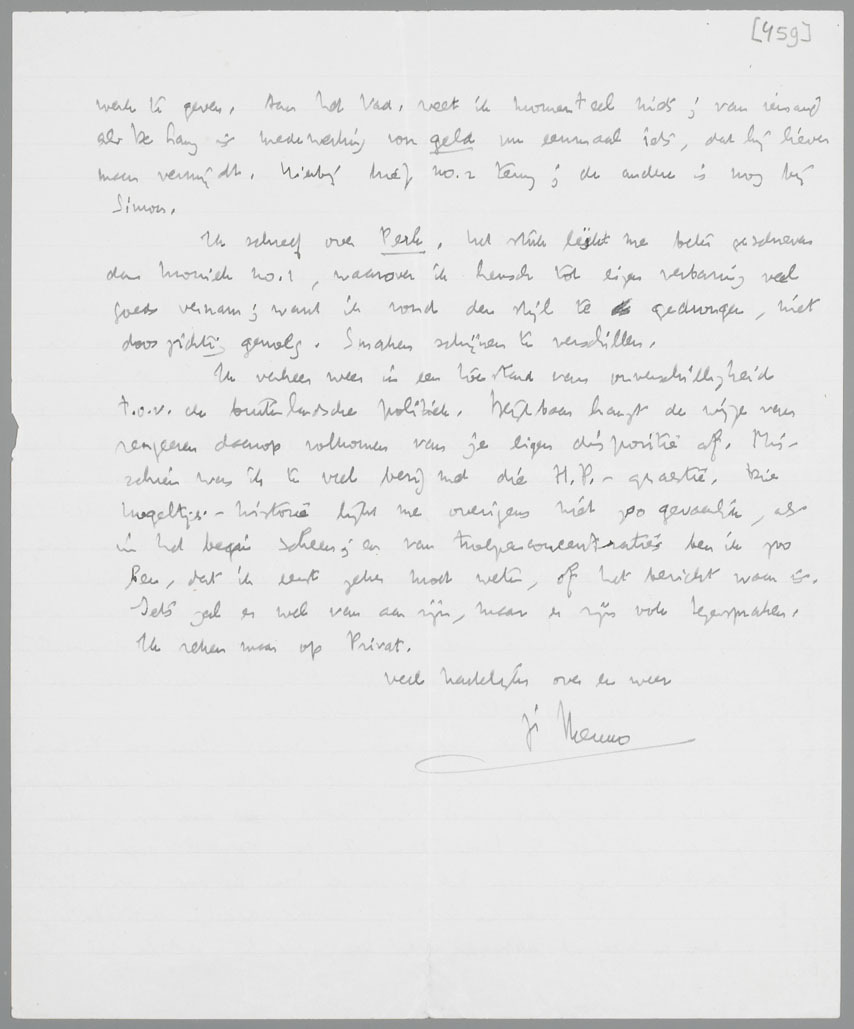 Ik verkeer weer in een toestand van onverschilligheid t.o.v. de buitenlandsche politiek. Blijkbaar hangt de wijze van reageeren daarop volkomen van je eigen dispositie af. Misschien was ik te veel bezig met die H.P.-quaestie. Die kogeltjes historie lijkt me overigens niet zoo gevaarlijk, als in het begin scheen; en van troepenconcentraties ben ik zoo beu, dat ik eerst zeker moet weten, of het bericht waar is. Iets zal er wel van aan zijn, maar er zijn ook tegenspraken. Ik reken maar op Privat.