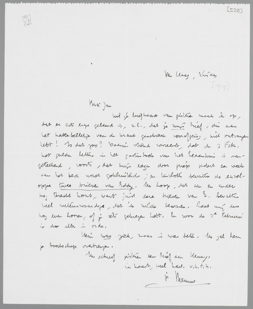 Uit je briefkaart van gisteren maak ik op, dat er iets ergs gebeurd is, n.l., dat je mijn brief, die aan het kattebelletje van de krant geschreven voorafging, niet ontvangen hebt! Is dat zoo? Daarin stond vooreerst, dat de 3 Febr. met gulden letters in het gastenboek van het heerenhuis is aangeteekend, voorts, dat mijn eega door griep sedert een week aan het bed wordt gekluisterd; en tenslotte bevatte de enveloppe twee brieven van Eddy. Ik hoop, dat een en ander nog terecht komt, want juist deze brieven van E. bevatten veel wetenswaardigs, dat ik wilde bewaren. Laat mij dus nog even hooren, of je iets gekregen hebt. En voor de 3e Februari is dus alles in orde.