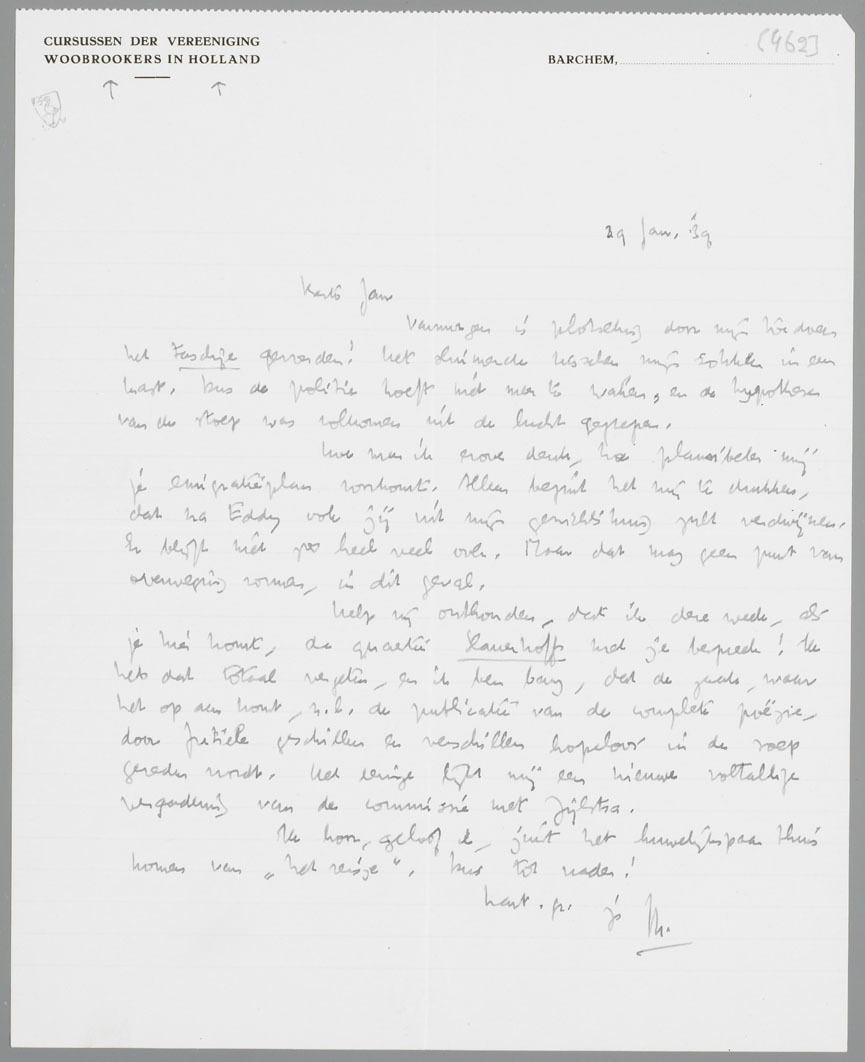 Help mij onthouden, dat ik deze week, als je hier komt, de quaestie Slauerhoff met je bespreek! Ik heb dat totaal vergeten, en ik ben bang, dat de zaak, waar het op aan komt, n.l. de publicatie van de complete poëzie, door futiele geschillen en verschillen hopeloos in de soep gereden wordt. Het eenige lijkt mij een nieuwe voltallige vergadering van de commissie met Zijlstra.