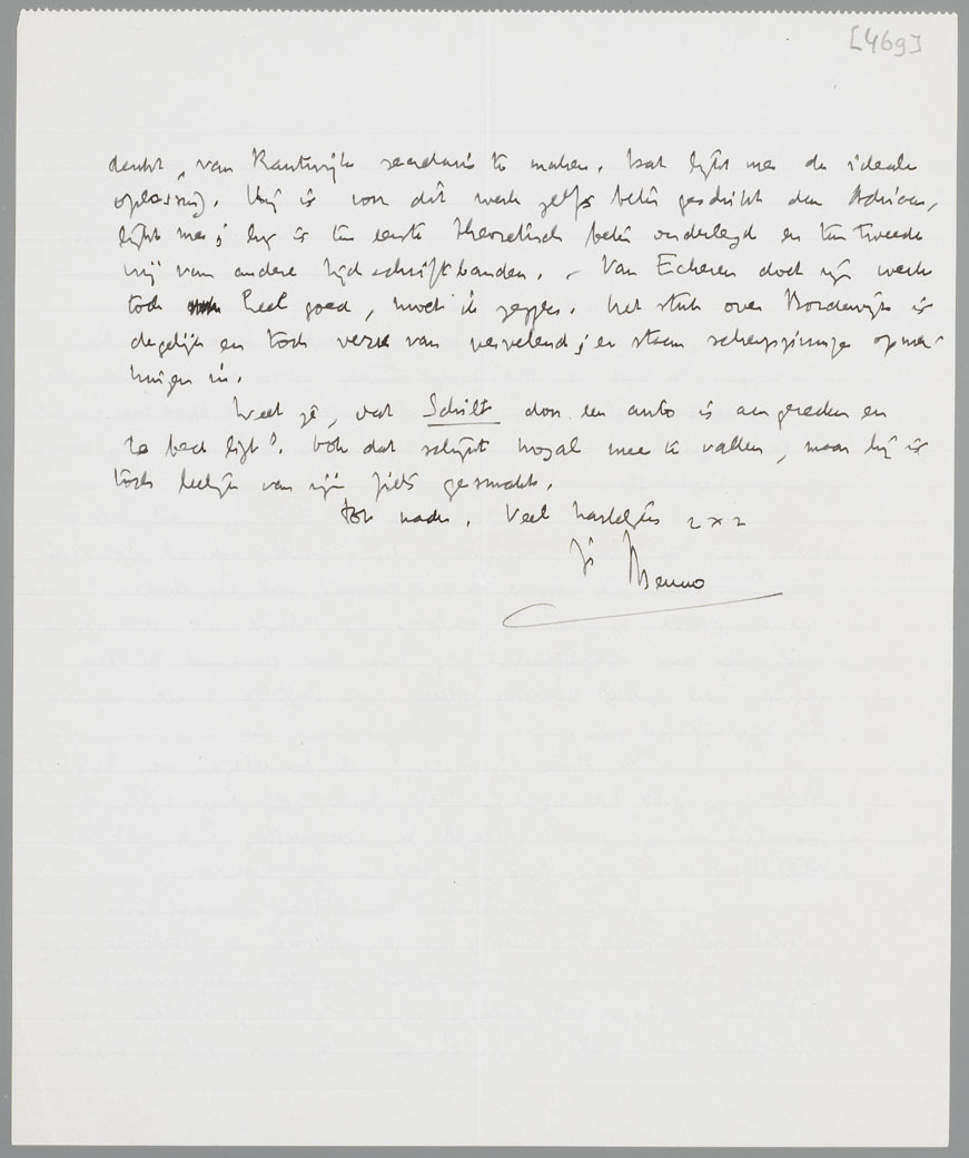 ‘Groot-Nederland’ van Maart maakt weer een uitstekenden indruk! Wim, die nu abonné is, betoont zich ook zeer tevreden over het tijdschrift, en hij is erg critisch op dit stuk! Moge het doenlijk zijn ook na je vertrek naar Kaapstad dit peil te handhaven. Ik hoor, dat je erover denkt, van Rantwijk secretaris te maken. Dat lijkt me de ideale oplossing. Hij is voor dit werk zelfs beter geschikt dan Adriaan, lijkt me; hij is ten eerste theoretisch beter onderlegd en ten tweede vrij van andere tijdschriftbanden. - Van Echeren doet zijn werk toch heel goed, moet ik zeggen. Het stuk over Bordewijk is degelijk en toch verre van vervelend; er staan scherpzinnige opmerkingen in.