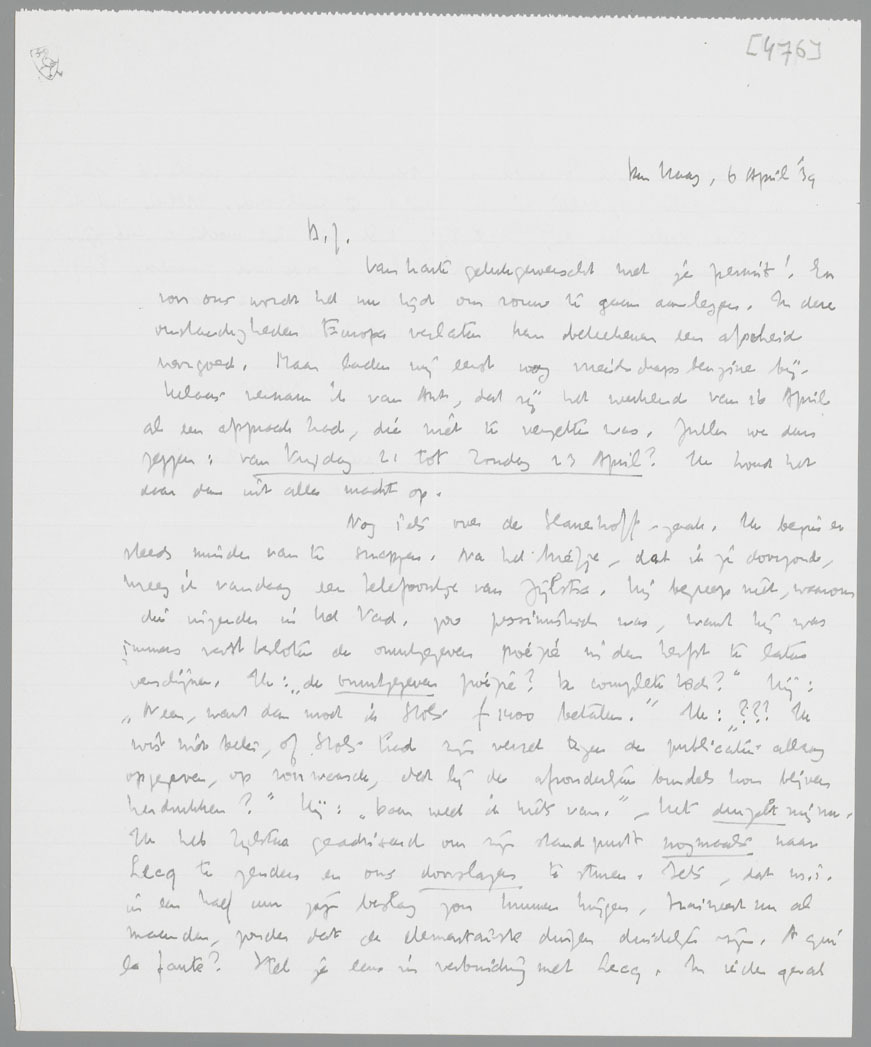 Nog iets over de Slauerhoff-zaak. Ik begin er steeds minder van te snappen. Na het briefje, dat ik je doorzond, kreeg ik vandaag een telefoontje van Zijlstra. Hij begreep niet, waarom die inzender in Het Vad. zoo pessimistisch was, want hij was immers vast besloten de onuitgegeven poëzie in den herfst te laten verschijnen. Ik: ‘de onuitgegeven poëzie? De complete toch?’ Hij: ‘Neen, want dan moet ik Stols ƒ1400 betalen.’ Ik:??? Ik wist niet beter, of Stols had zijn verzet tegen de publicatie allang opgegeven, op voorwaarde, dat hij de afzonderlijke bundels kon blijven herdrukken?’ Hij: ‘Daar weet ik niets van.’ - Het duizelt mij nu. Ik heb Zijlstra geadviseerd om zijn standpunt nogmaals naar Lecq te zenden en ons doorslagen te sturen. Iets, dat m.i. in een half uur zijn beslag zou kunnen krijgen, traineert nu al maanden, zonder dat de elementairste dingen duidelijk zijn. A qui la faute? Stel je eens in verbinding met Lecq. In ieder geval heeft Z. zich vanmiddag uitdrukkelijk bereid verklaard de complete gedichten in den herfst te publiceeren. Alleen met de twee deelen kan hij, zegt hij, niet uit, het moeten er drie zijn. Ik dacht, dat Lecq dat ook al lang in orde had gemaakt. Pff!