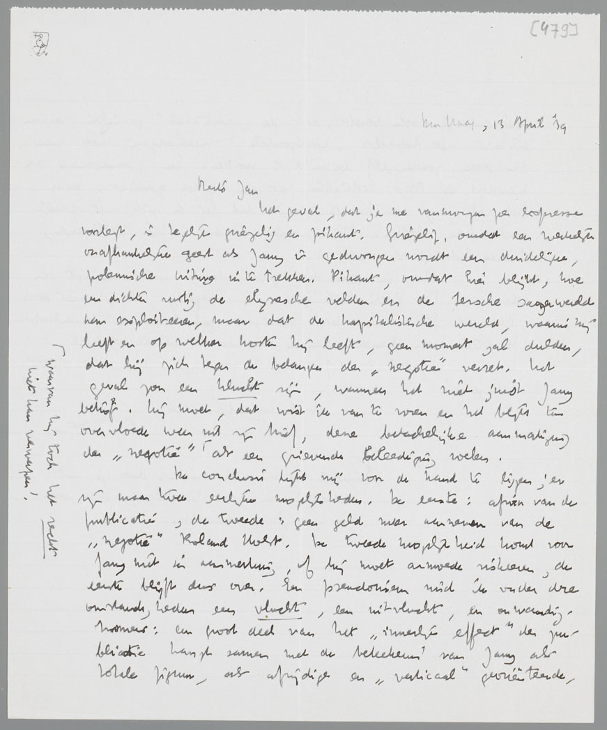 Het geval, dat je me vanmorgen per expresse voorlegt, is tegelijk griezelig en pikant. Griezelig, omdat een werkelijk onafhankelijke geest als Jany is gedwongen wordt een duidelijke, polemische uiting in te trekken. Pikant, omdat hier blijkt, hoe een dichter rustig de elyseesche velden en de Iersche sagenwereld kan exploiteeren, maar dat de kapitalisitische wereld, waarin hij leeft en op welker kosten hij leeft, geen moment zal dulden, dat hij zich tegen de belangen der ‘negotie’ verzet. Het geval zou een klucht zijn, wanneer het niet juist Jany betrof. Hij moet, dat wist ik van te voren en het blijkt ten overvloede weer uit zijn brief, deze belachelijke aanmatiging der ‘negotie’ <waarvan hij toch het recht niet kan verwerpen!> als een grievende beleediging voelen.