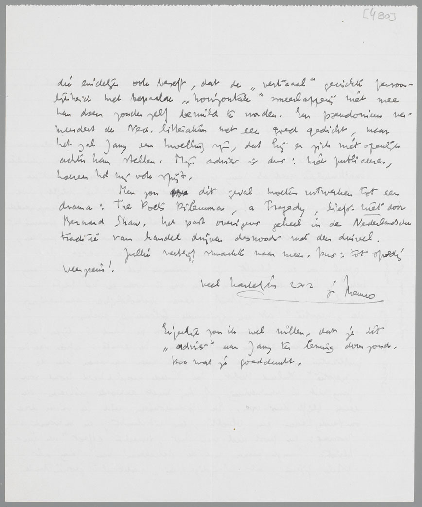 Immers: een groot deel van het ‘innerlijk effect’ der publicatie hangt samen met de betekenis van Jany als totale figuur, als afzijdige en ‘verticaal’ georiënteerde, die eindelijk ook beseft, dat de ‘verticaal’ geschikte persoonlijkheid met bepaalde ‘horizontale’ smeerlapperij niet mee kan doen zonder zelf bevuild te worden. Een pseudoniem vermeerdert de Ned. litteratuur met een goed gedicht, maar het zal Jany een kwelling zijn, dat hij er zich niet openlijk achter kan stellen. Mijn advies is dus: niet publiceeren, hoezeer het mij ook spijt.
