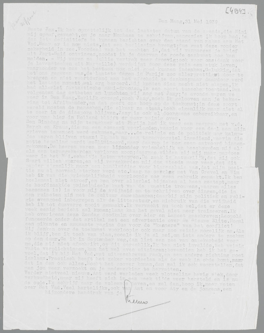Wij waren na jullie vertrek zeer droevig; ook voor ons (dank voor je levensteeken uit Marseille) verdwijnt door deze reis een stuk leven, waarzonder we ons het bestaan nog niet goed kunnen indenken. Gelukkig, dat het ons gegeven was, de laatste dagen in Parijs zoo allerprettigst door te brengen en niet voortdurend aan het afscheid te denken; maar daardoor werd het laatste moment wel erg beroerd. Wij konden dien nacht niet slapen, ik had allerlei fantastische semi-droomen, in een soort tusschentoestand. Den volgenden dag ontbeten en lunchten wij nog met Jany; 's avonds waren we weer in Den Haag. Eerlijk gezegd, noch Jany, noch ik gelooven aan je bekeering tot Afrikaander, en dat geeft ons hoop op de toekomst; in deze soort wereld moeten de menschen, die elkaar na staan, toch eigenlijk maar niet al te zeer in de diaspora blijven. Jany is ook al doorgaans onbereikbaar, en voor ons hier in Holland blijft er maar weinig over.