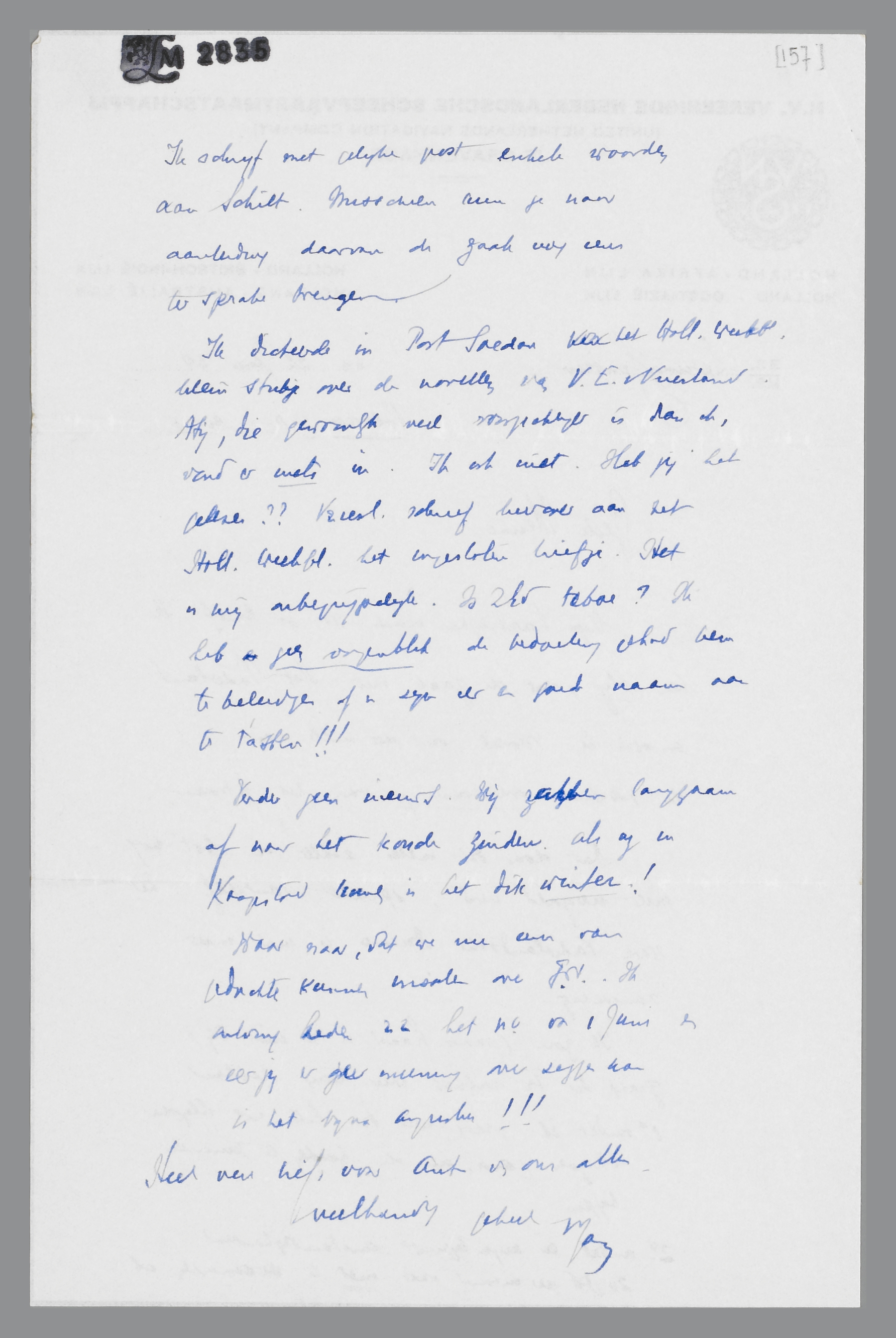Ik schrijf met gelijke post enkele woorden aan Schilt. Misschien kun je naar aanleiding daarvan de zaak nog eens te sprake brengen. Ik dicteerde in Post Soedan voor het Holl. Weekbl. klein stukje over de novellen van V.E. Vriesland. Aty, die gewoonlijk veel voorzichtiger is dan ik, vond er niets in. Ik ook niet. Heb jij het gelezen?? Vriesl. schreef hierover aan het Holl. Weekbl. het ingesloten briefje. Het is mij onbegrijpelijk. Is ZEd taboe? Ik heb geen oogenblik de bedoeling gehad hem te beledigen of in zijn eer en goede naam aan te tasten!!!