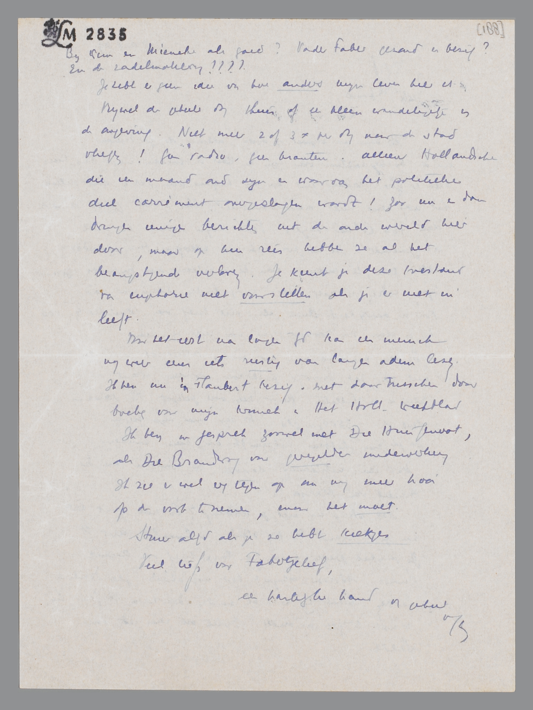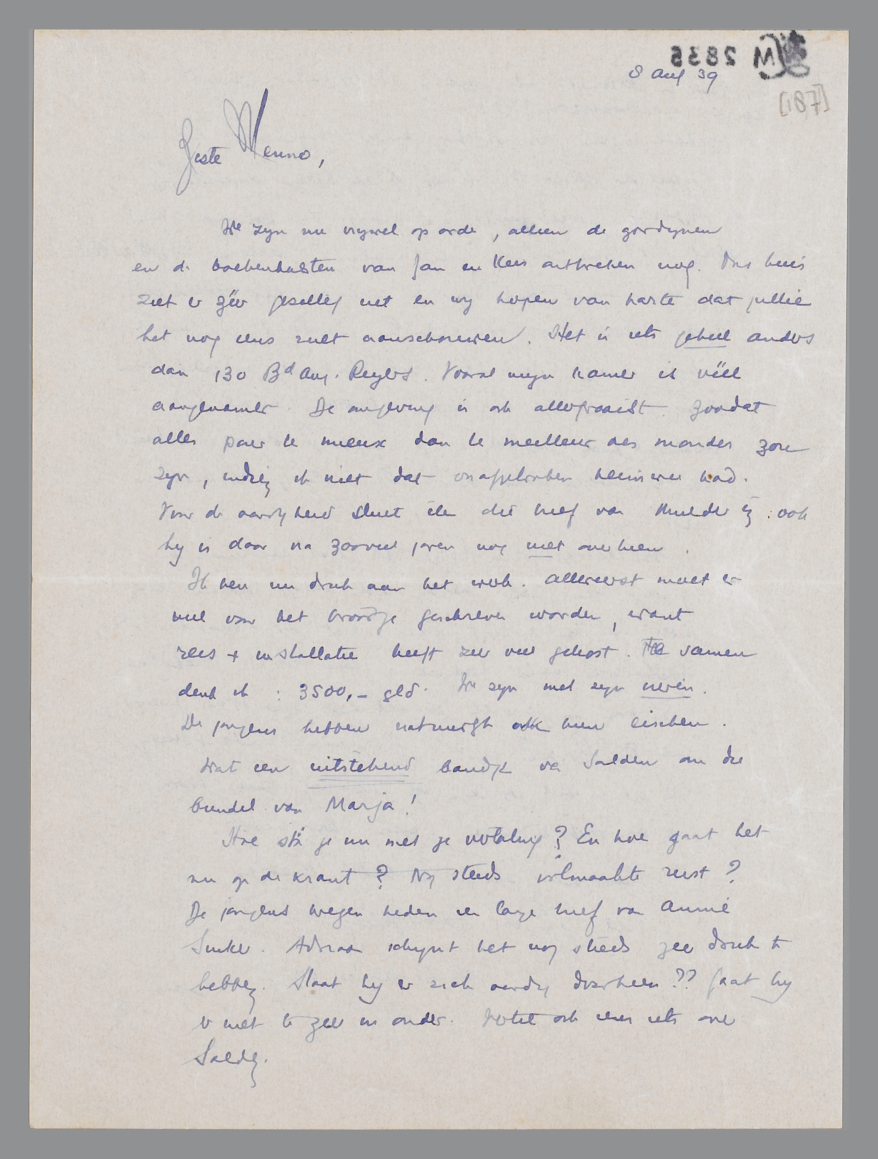 Hoe sta je nu met je vertaling? En hoe gaat het nu op de krant? Nog steeds volmaakte rust? De jongens kregen heden een lange brief van Annie Suiker. Adriaan schijnt het nog steeds zeer druk te hebben. Slaat hij er zich aardig doorheen? Gaat hij er niet te zeer in onder? Vertel ook eens iets over Salden.
