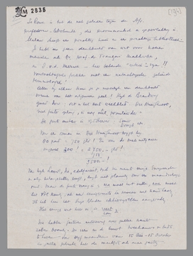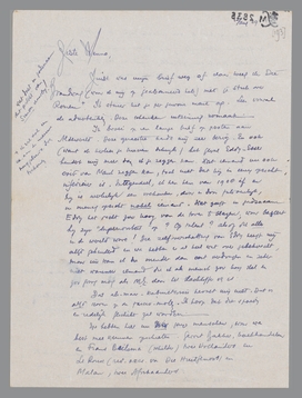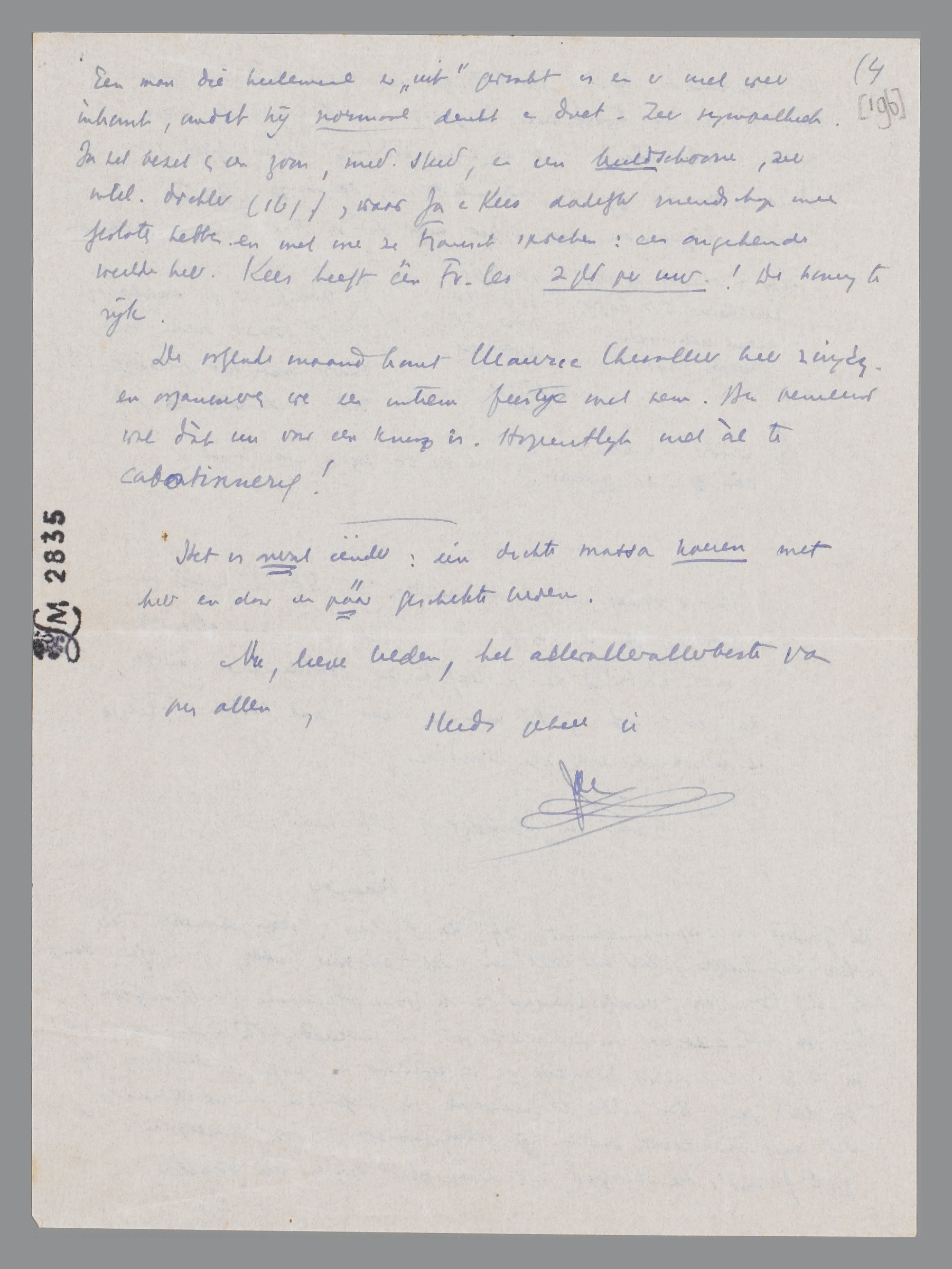 Ik broei op een lange brief op pooten aan Aldewereld. Deze quaeste houdt mij zeer bezig. En ook (want ik herlees je brieven dikwijls) het geval Eddy - Esser hindert mij meer dan ik je zeggen kan. Wat iemand nu ook ooit van Mauk zeggen kan, toch niet dat hij in eenig opzicht inferieur is. Integendeel, ik ken hem van 1908 af en hij is werkelijk een volkomen, door en door fatsoenlijk, in menig opzicht nobel iemand. Wat geeft in godsnaam Eddy het recht zoo hoog van de toren te blazen; waar baseert hij zijn ‘superioriteit’ op? Op talent? Alsof dat alles in de wereld ware! Die zelfoverschatting van Eddy heeft mij altijd gehinderd en we hebben er al heel wat over gebekvecht, maar nu kan ik die minder dan ooit verdragen en zeker niet wanneer iemand die ik als mensch zoo hoog heb en zo graag mag als M.E. daar het slachtoffer van is.