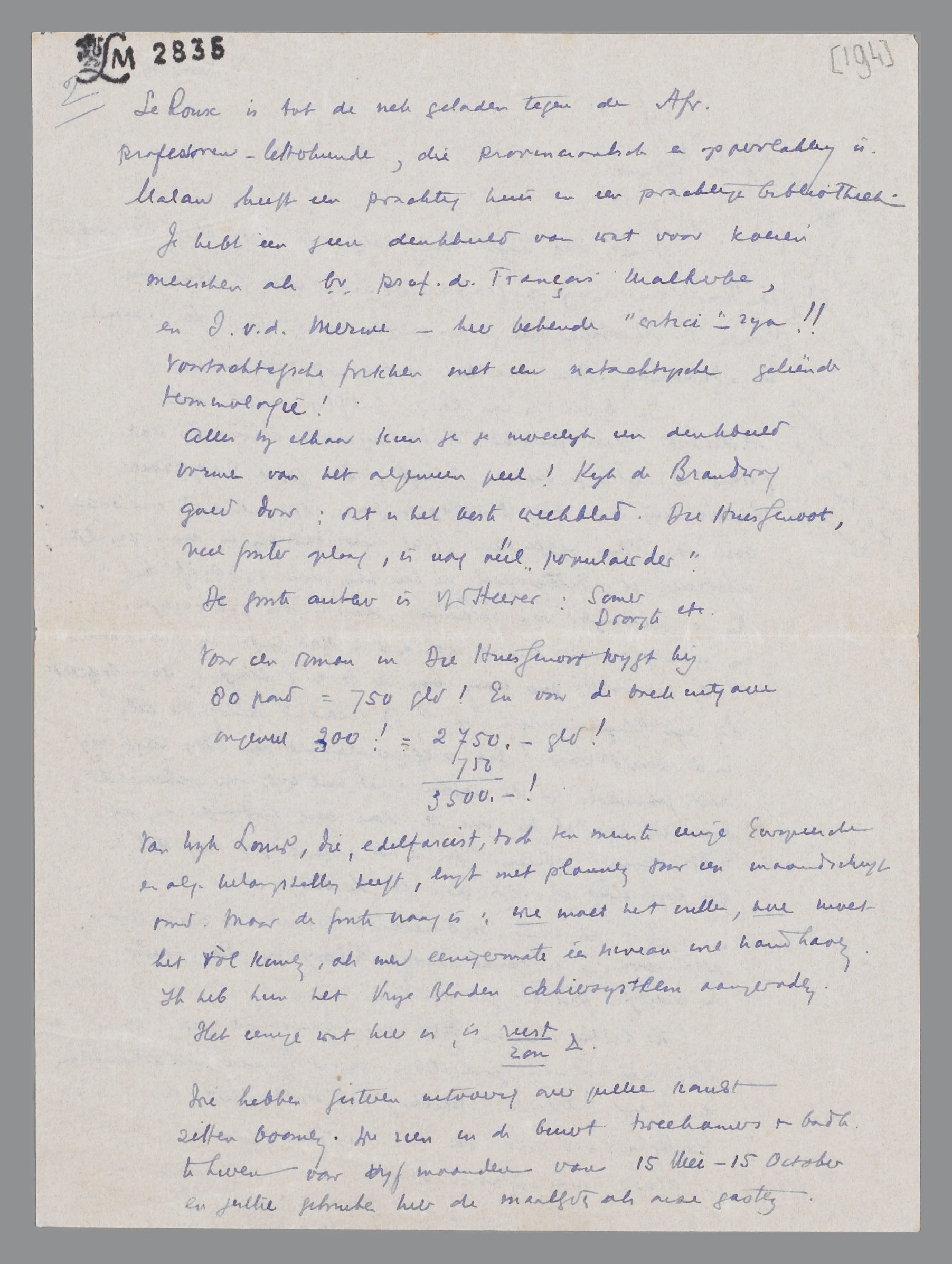 Alles bij elkaar kun je je moeilijk een denkbeeld vormen van het algemeen peil! Kijk Die Brandwag goed door: dat is het beste weekblad. Die Huisgenoot, veel grooter oplaag, is nog véél ‘populairder’. De beste auteur is vd Heever: Somer Droogte etc. Voor een roman in Die Huisgenoot krijgt hij 80 pond = 750 gld! En voor de boek uitgave ongeveer 300! =