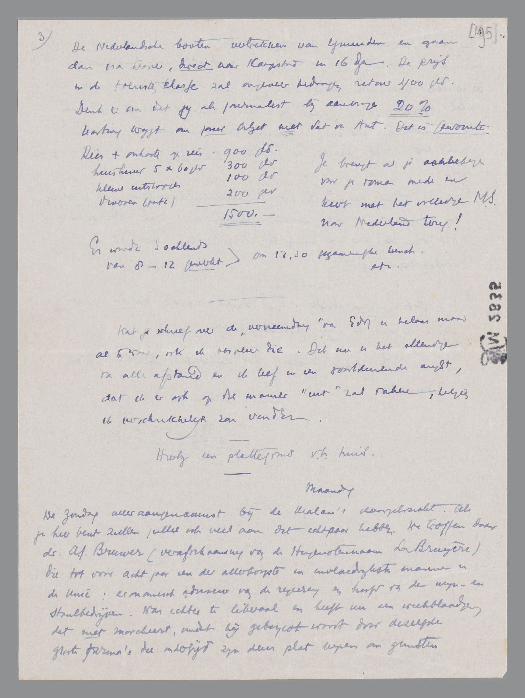 De Nederlandsche booten vertrekken van IJmuiden en gaan dan via Dover, direct naar Kaapstad in 16 dagen. De prijs in de toeristenklasse zal ongeveer bedragen retour 400 gld. Denk er om dat jij als journalist bij aanvragen 20% korting krijgt over jouw biljet niet dat van Ant. Dat is gewoonte.