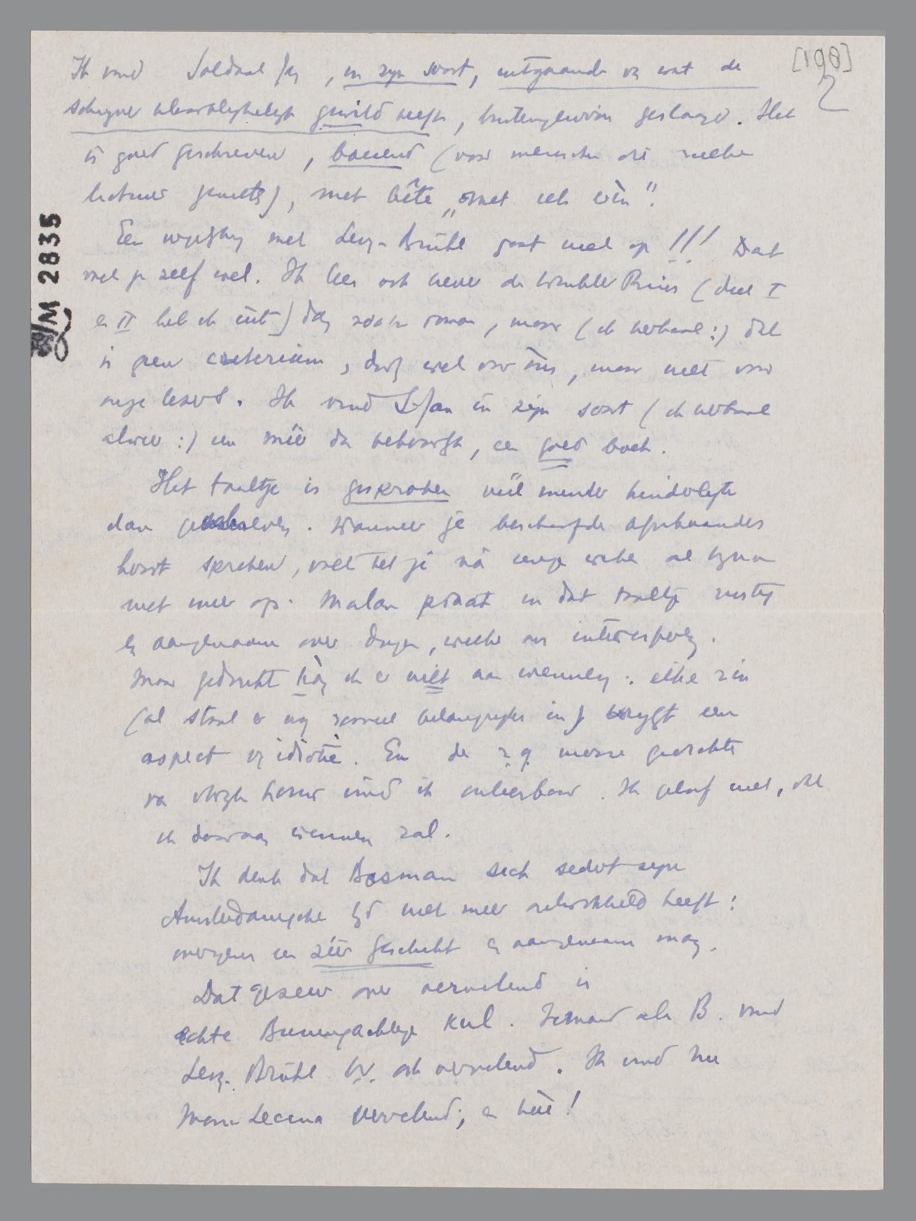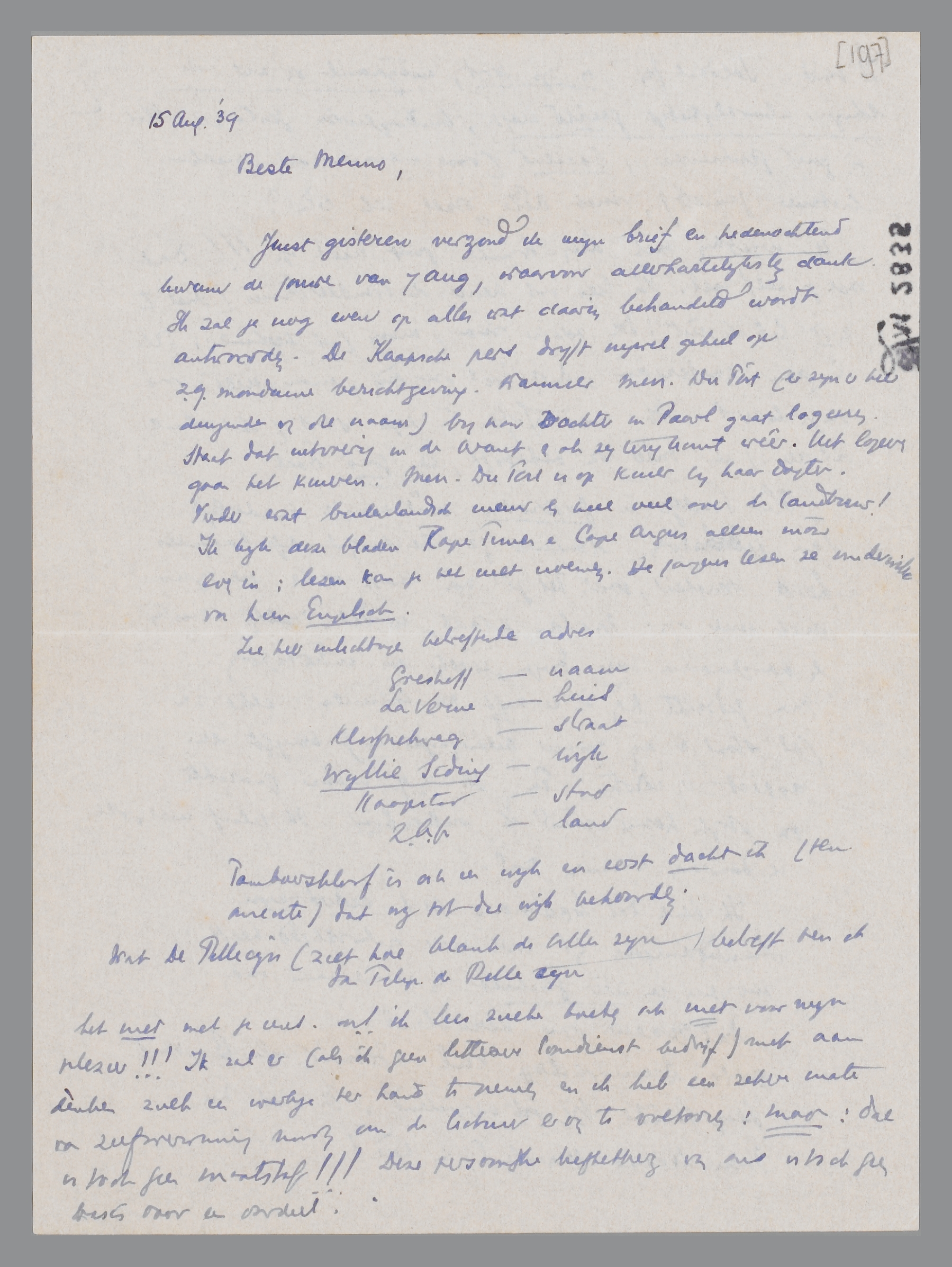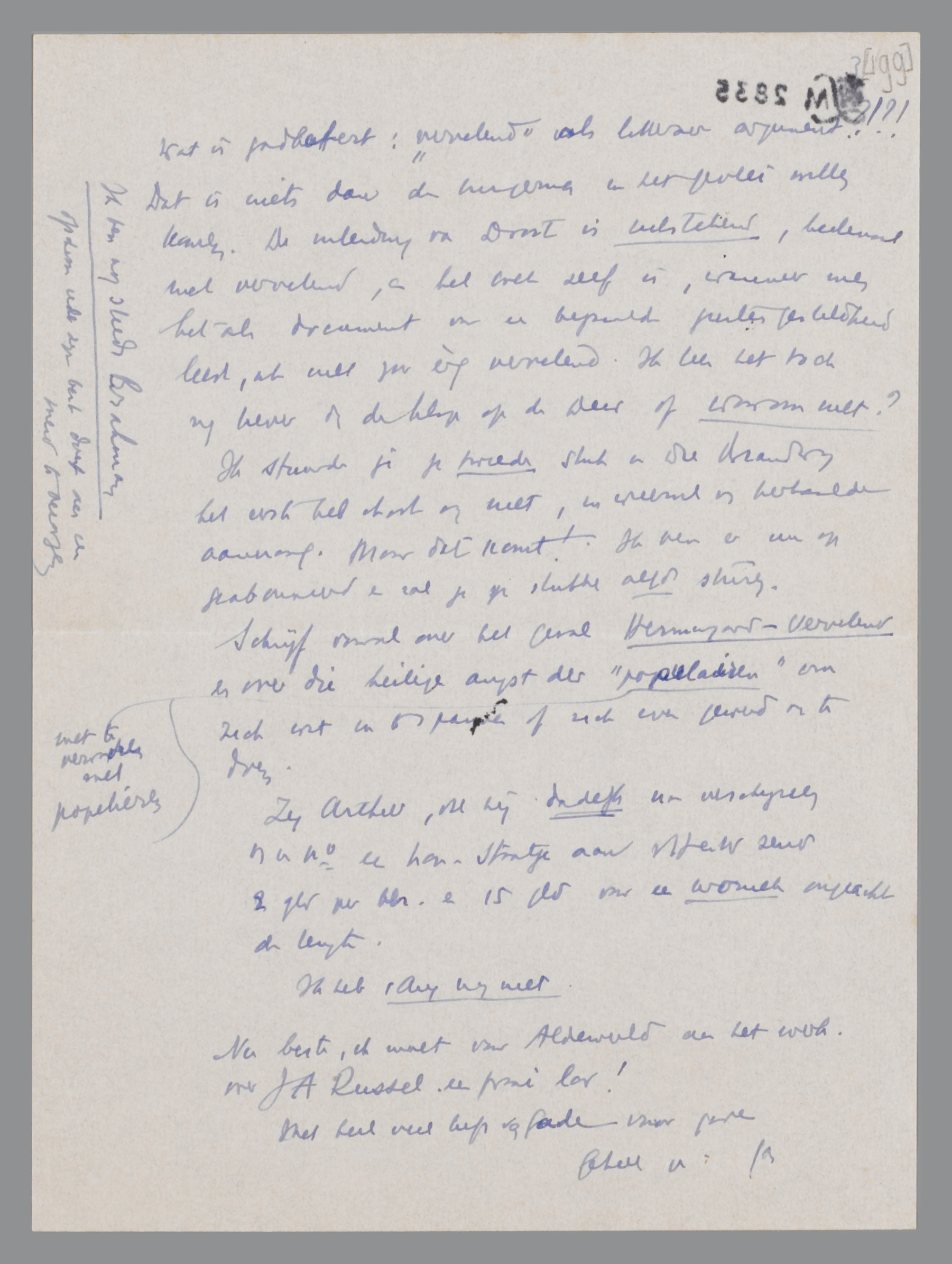 Schrijf vooral over het geval Hermingard-vervelend en over die heilige angst der ‘populairen’ <niet ter verwarren met populieren> om zich wat in te spannen of zich even geweid[?] voor te doen.