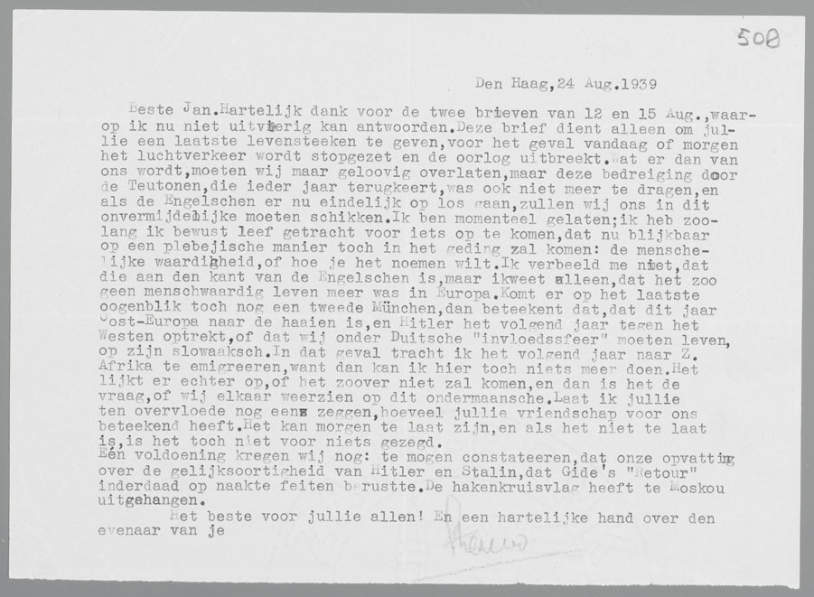 Hartelijk dank voor de twee brieven van 12 en 15 Aug., waarop ik nu niet uitvoerig kan antwoorden. Deze brief dient alleen om jullie een laatste levensteeken te geven, voor het geval vandaag of morgen het luchtverkeer wordt stopgezet en de oorlog uitbreekt. Wat er dan van ons wordt, moeten wij maar geloovig overlaten, maar deze bedreiging door de Teutonen, die ieder jaar terugkeert, was ook niet meer te dragen, en als de Engelschen er nu eindelijk op los gaan, zullen wij ons in dit onvermijdelijke moeten schikken. Ik ben momenteel gelaten; ik heb zoolang ik bewust leef getracht voor iets op te komen, dat nu blijkbaar op een plebejische manier toch in het geding zal komen: de menschelijke waardigheid, of hoe je het noemen wilt. Ik verbeeld me niet, dat die aan den kant van de Engelschen is, maar ik weet alleen, dat het zoo geen menschwaardig leven meer was in Europa. Komt er op het laatste oogenblik toch nog een tweede München, dan beteekent dat, dat dit jaar Oost-Europa naar de haaien is, en Hitler het volgend jaar tegen het Westen optrekt, of dat wij onder Duitsche ‘invloedssfeer’ moeten leven, op zijn slowaaksch. In dat geval tracht ik het volgend jaar naar Z. Afrika te emigreeren, want dan kan ik hier toch niets meer doen. Het lijkt er echter op, of het zoover niet zal komen, en dan is het de vraag, of wij elkaar weerzien op dit ondermaansche. Laat ik jullie ten overvloede nog eens zeggen, hoeveel jullie vriendschap voor ons beteekend heeft. Het kan morgen te laat zijn, en als het niet te laat is, is het toch niet voor niets gezegd.