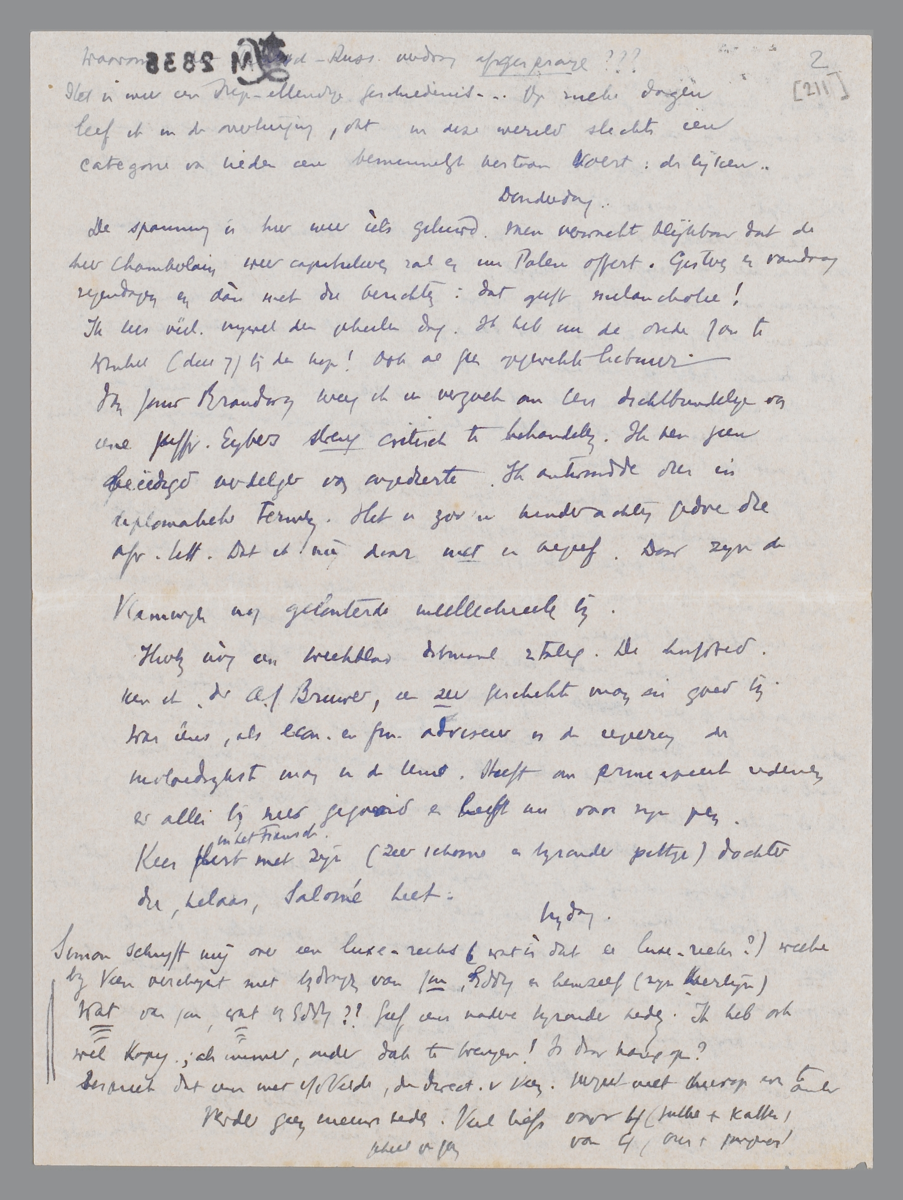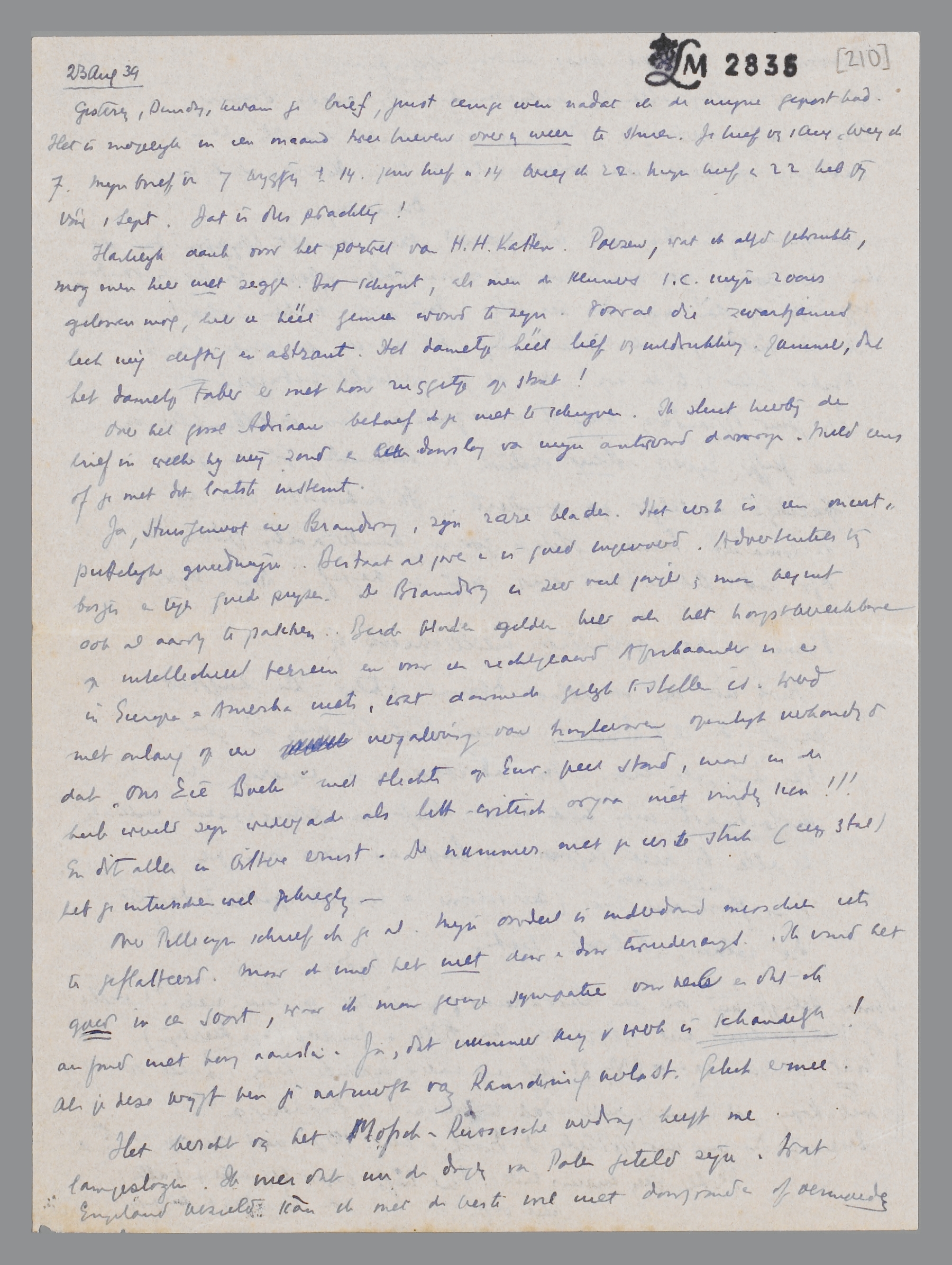 Het bericht over het Mofsch-Russische verdrag heeft me lamgeslagen. Ik meen dat nu de dagen van Polen geteld zijn. Wat Engeland bezield kán ik met de beste wil niet doorgronden of vermoeden. Waarom het Duitsch-Russ verdrag afgedwongen[?]??? Het is weer een diep-ellendige geschiedenis. Op zulke dagen leef ik in de overtuiging, dat in deze wereld slechts één categorie van lieden een beminnelijk bestaan voert: de lijken.