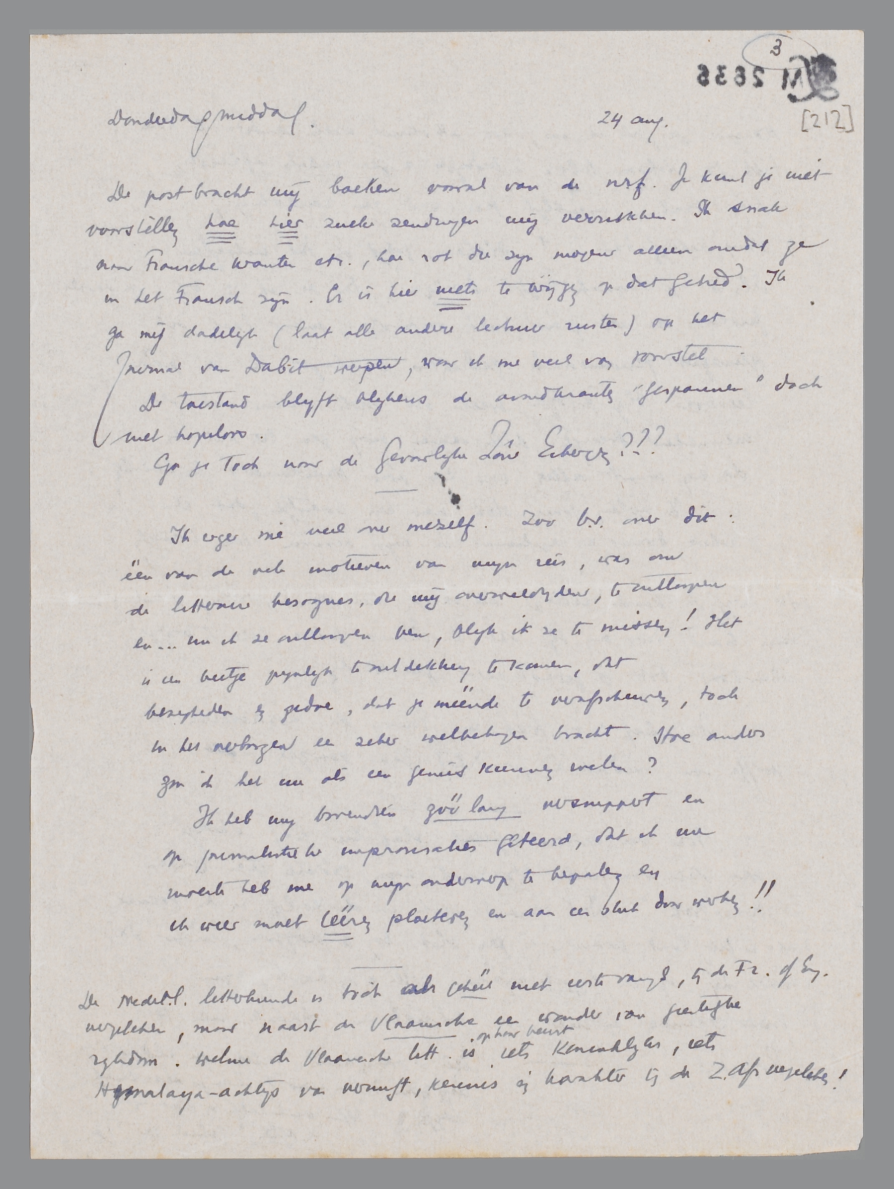 De post bracht mij boeken, vooral van de nrf. Je kunt je niet voorstellen hoe hier zulke zendingen mij verrukken. Ik snak naar Fransche kranten etc., hoe rot die zijn mogen alleen omdat ze in het Fransch zijn. Er is hier niets te krijgen op dat gebied. Ik ga mij dadelijk (laat alle andere lectuur rusten) op het Journal van Dabit werpen, waar ik me veel van voorstel.