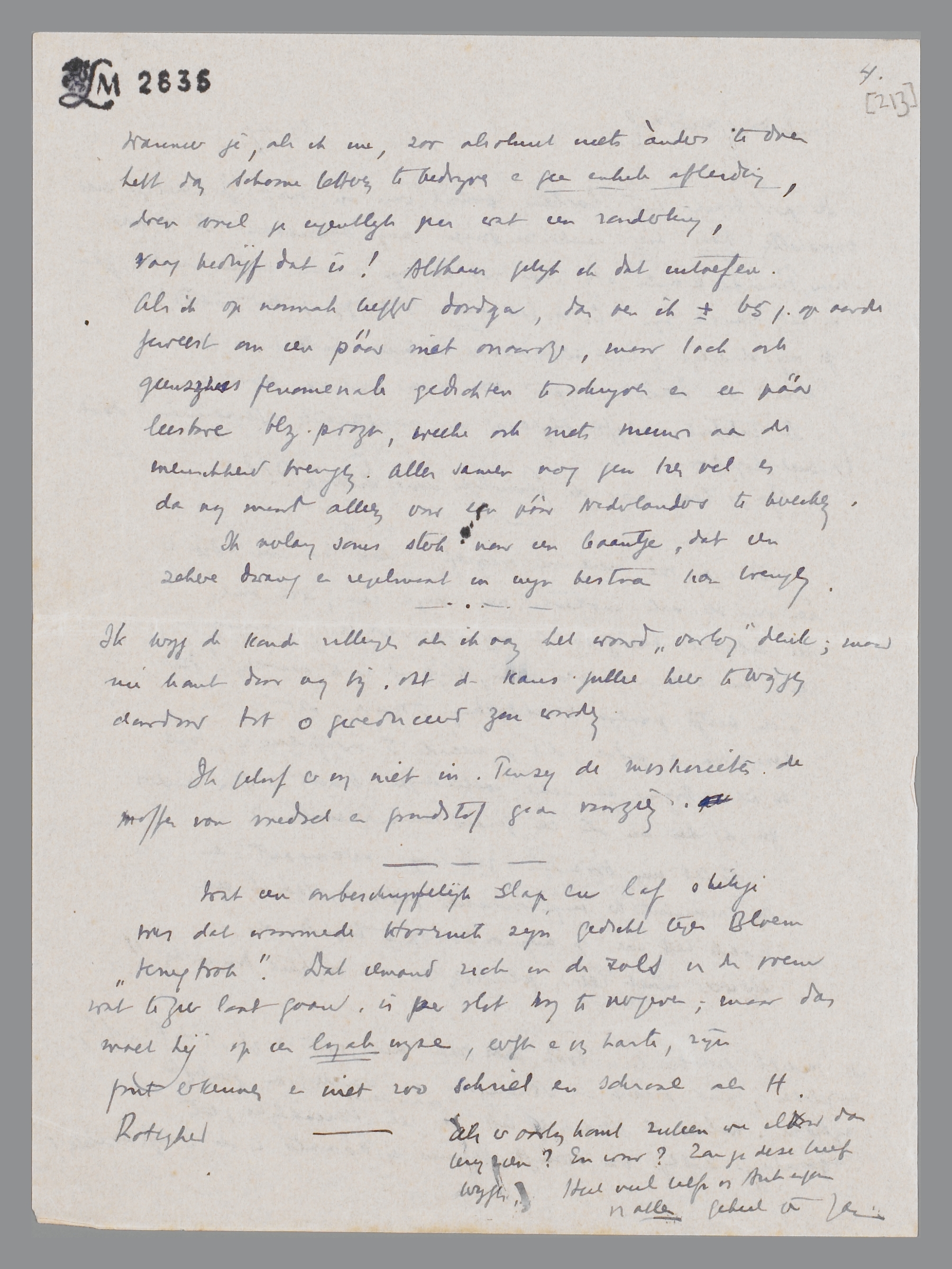 Wat een onbeschrijfelijk slap en laf stukje was dat waarmede Hoornik zijn gedicht tegen Bloem ‘terugtrok’. Dat iemand zich in de roes van de roem wat te zeer laat gaan, is per slot nog te vergeven; maar dan moet hij op een loyale wijze, eerlijk[?] en van harte, zijn fout erkennen en niet zoo schriel en schraal als H. [onleesbaar]