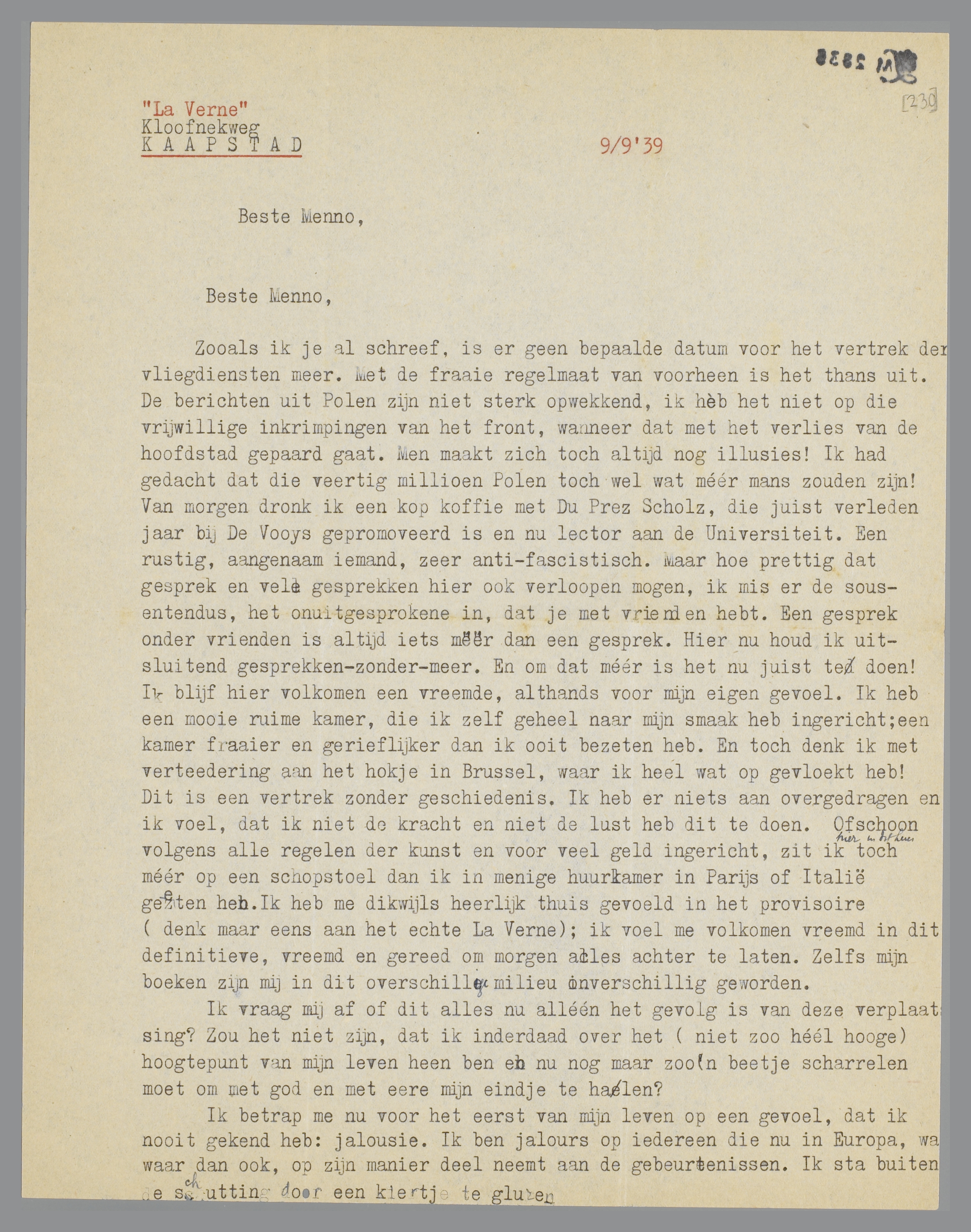Zooals ik je al schreef, is er geen bepaalde datum voor het vertrek der vliegdiensten meer. Met de fraaie regelmaat van voorheen is het thans uit. De berichten uit Polen zijn niet sterk opwekkend, ik hèb het niet op die vrijwillige inkrimpingen van het front, wanneer dat met het verlies van de hoofdstad gepaard gaat. Men maakt zich altijd nog illusies! Ik had gedacht dat die veertig millioen Polen toch wel wat méér mans zouden zijn! Vanmorgen dronk ik een kop koffie met Du Prez Scholz, die juist verleden jaar bij De Vooys gepromoveerd is en nu lector aan de Universiteit. Een rustig, aangenaam iemand, zeer anti-fascisitisch. Maar hoe prettig dat gesprek en vele gesprekken hier ook verloopen mogen, ik mis er de sous-entendus, het onuitgesprokene in, dat je met vrienden hebt. Een gesprek onder vrienden is altijd iets méér dan een gesprek. Hier nu houd ik uitsluitend gesprekken-zonder-meer. En om dat meer is het nu juist te doen! Ik blijf hier volkomen een vreemde, althands voor mijn eigen gevoel. Ik heb een mooie ruime kamer, die ik zelf geheel naar mijn smaak heb ingericht; een kamer fraaier en gerieflijker dan ik ooit bezeten heb. En toch denk ik met verteedering aan het hokje in Brussel, waar ik heel wat op gevloekt heb! Dit is een vertrek zonder geschiedenis. Ik heb er niets aan overgedragen en ik voel, dat ik niet de kracht en niet de lust heb dit te doen. Ofschoon volgens alle regelen der kunst en voor veel geld ingericht, zit ik <hier in het huis> toch méér op een schopstoel dan ik in menige huurkamer in Parijs of Italië gezeten heb. Ik heb me dikwijls heerlijk thuis gevoeld in het provisioire (denk maar eens aan het echte La Verne); Ik voel me volkomen vreemd in dit definitieve, vreemd en gereed om morgen alles achter te laten. Zelfs mijn boeken zijn mij in dit onverschillige milieu onverschillig geworden.