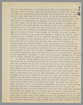 Het hindert mij ook zeer dat ik niet aanwezig kan zijn bij de aankomst van Eddy. Dat ik de ontwikkeling van Adriaan, die mij zoo ter harte gaat, niet meer kan volgen. Dat ik Groot Nederland, waar ik werkelijk in opging, niet naar behooren verzorgen kan. Dat ik, wanneer ik over x jaar terugkeer, een vreemdeling in jullie midden zal zijn. Ik heb nooit iets gevoeld van leeftijd. Ik heb alleen aan uiterlijke merkteekenen waargenomen dat ik ouder werd. Nu voel ik mij ouder; de veer is gesprongen. Het verschil is groot. Vroeger had ik, hoe beroerd het ook ging, hoe angstig en zorgelijk we leefden, altijd plannen voor de toekomst; nu is de toekomst volkomen voor mij weg gevallen en ik leef geheel in het verleden. Wat er in de toekomst komen kan laat mij koud omdat het toch niets goeds kan zijn. Maar ieder kleinigheidje van vroeger krijgt een zeldzaame waarde. Ik kan mij urenlang zoet houden met het herleven (en daarbij natuurlijk verfraaien) van de geringste gebeurtenissen uit het verleden. Mijn optimisme projecteer ik niet meer naar voren, doch naar achteren. Is dat niet het meest kenmerkende seniliteitsverschijnsel??!! De laatste Brusselsche jaren, de hemel weet hoe ik ze gevloekt heb, lijken mij nu één onafgebroken zaligheid. Ik ben bereid de heeren Vlamingen en bloc genie toe te kennen, wanneer ik morgen weer naar de Auguste Reyers getooverd was!!!