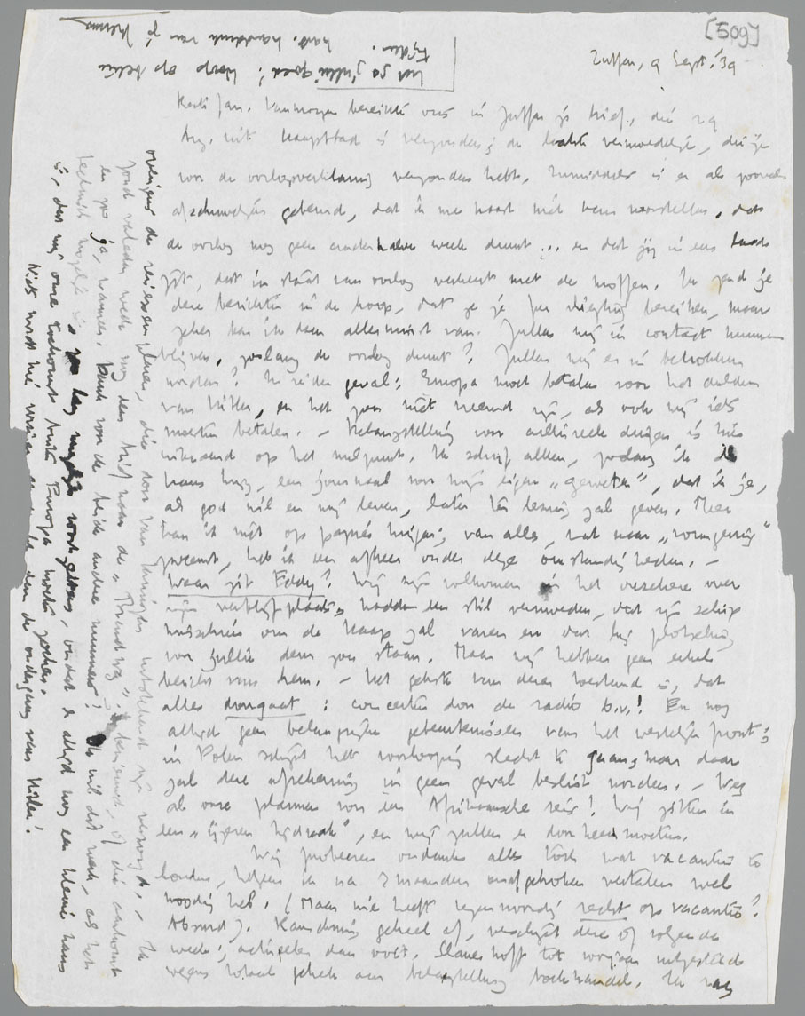 Vanmorgen bereikte ons in Zutfen je brief, die 29 Aug. uit Kaapstad is verzonden; de laatste vermoedelijk, die je voor de oorlogsverklaring verzonden hebt. Inmiddels is er al zooveel afschuwelijks gebeurd, dat ik me haast niet kan voorstellen, dat de oorlog nog geen anderhalve week duurt... en dat jij in een land zit, dat in staat van oorlog verkeert met de moffen. Ik zend je deze berichten in de hoop, dat ze je per vliegtuig bereiken, maar zeker ben ik daar allerminst van. Zullen wij in contact kunnen blijven, zoolang de oorlog duurt? Zullen wij er in betrokken worden? In ieder geval: Europa moet betalen voor het dulden van Hitler, en het zou niet vreemd zijn, als ook wij iets moeten betalen.