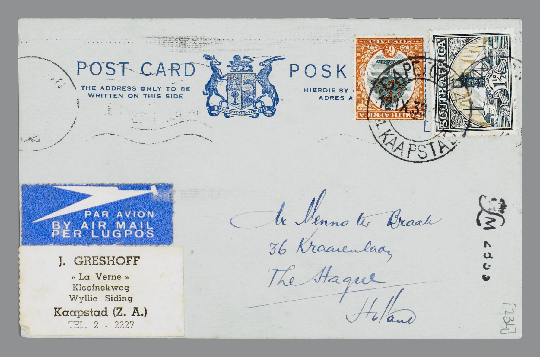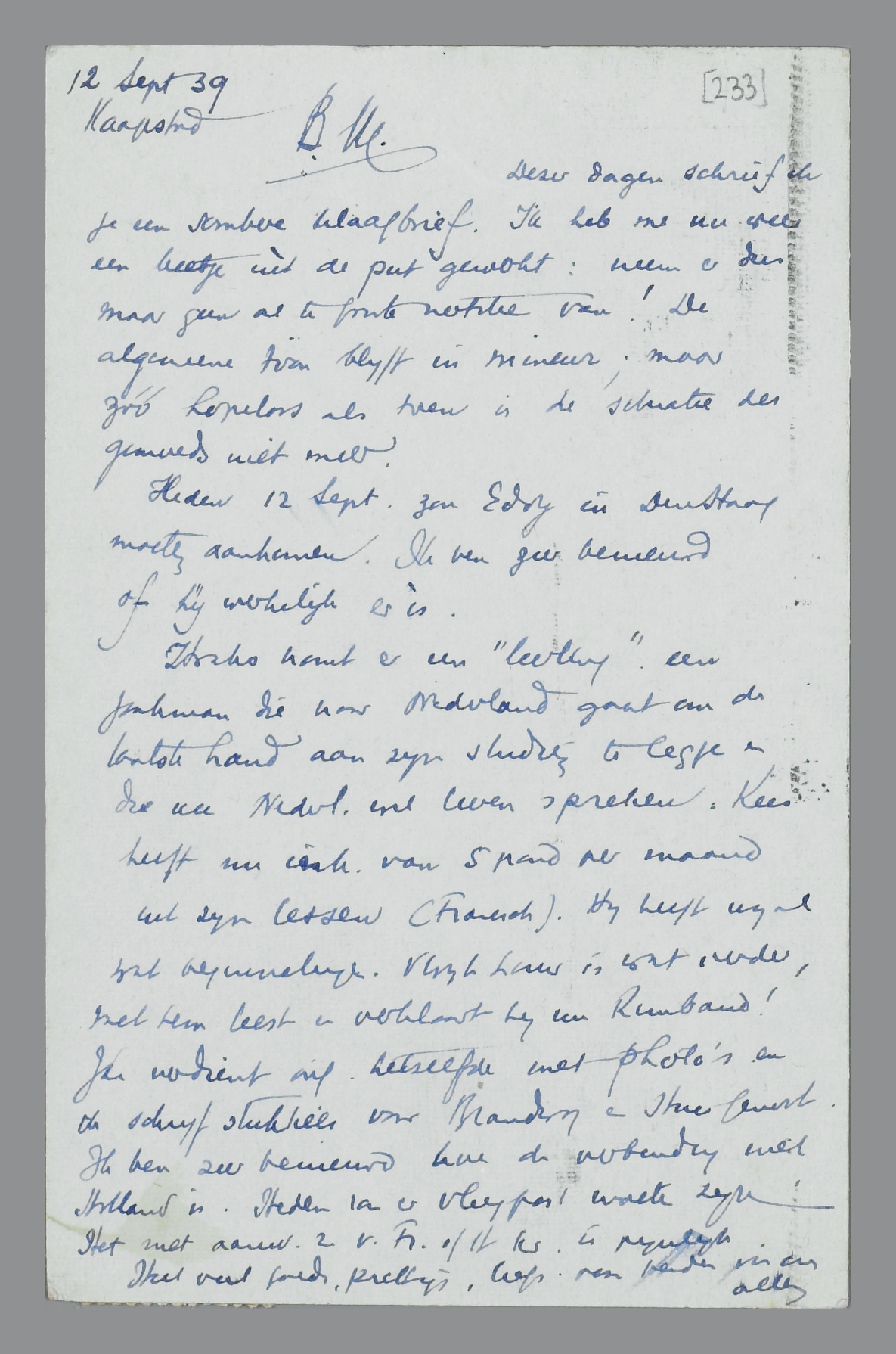 Straks komt er een ‘leerling’, een jongeman die naar Nederland gaat om de laatste hand aan zijn studie te leggen en die nu Nederl. wil leren spreken: Kees heeft nu ink. van 5 pond per maand met zijn lessen (Fransch). Hij heeft nogal wat beginnelingen. V Wijk Louw is wat verder, met hem leest en verklaart hij nu Rimbaud! Jan verdient ong. hetzelfde met photo's en ik schrijf stukkies voor Brandwag en Huisgenoot. Ik ben zeer benieuwd hoe de verbinding met Holland is. Heden zou er vliegpost moeten zijn!