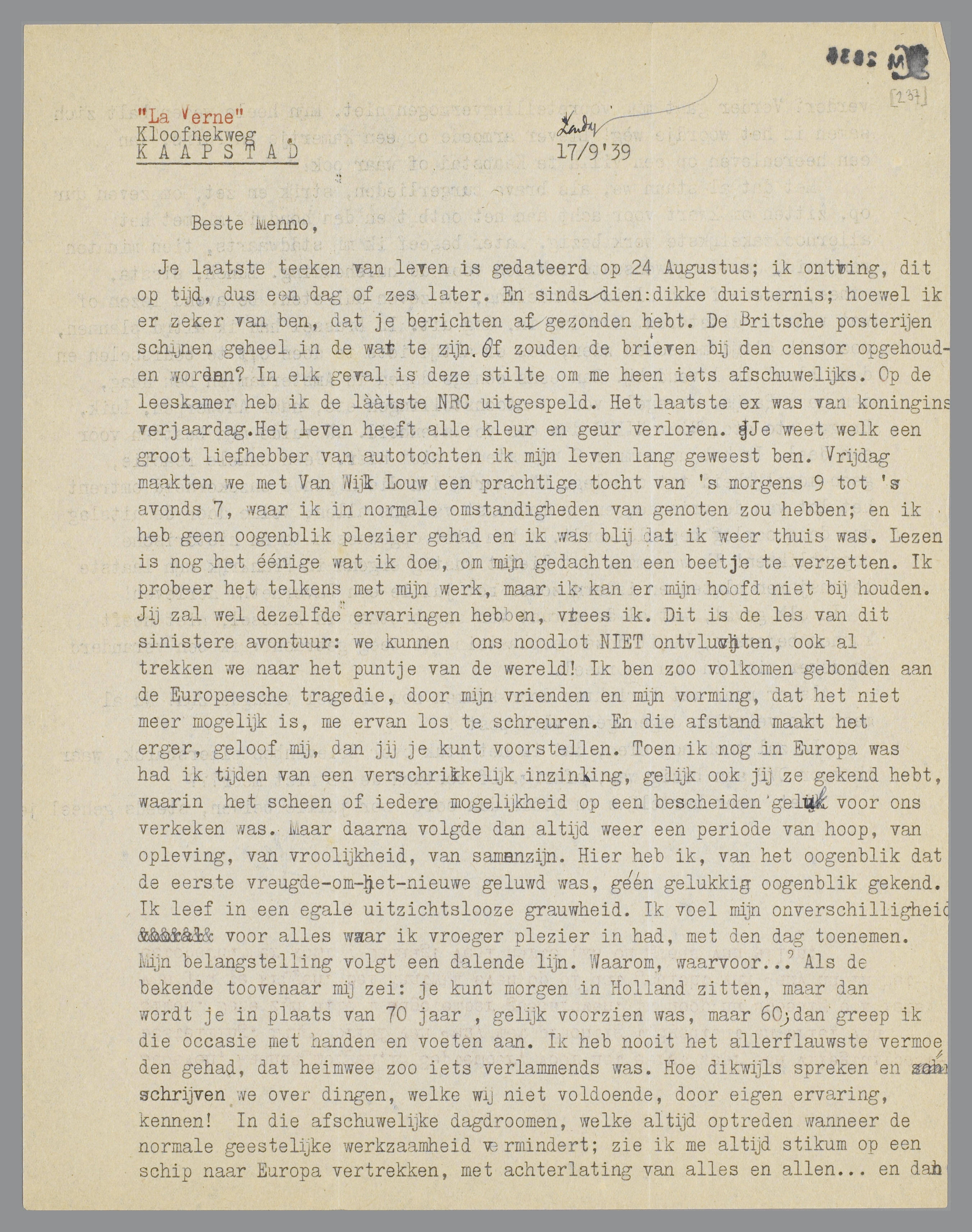 Je laatste teeken van leven is gedateerd op 24 Augustus: ik ontving, dit op tijd, dus zes dagen later. En sindsdien: dikke duisternis; hoewel ik er zeker van ben dat je berichten afgezonden hebt. De Britsche posterijen schijnen geheel in de war te zijn. Of zouden den brieven bij den censor opgehouden worden? In elk geval is deze stilte om me heen iets afschuwelijks. Op de leeskamer heb ik de lààtste NRC uitgespeld. Het laatste ex was van koningins verjaardag. Het leven heeft alle kleur en geur verloren. Je weet welk een groot liefhebber van autotochten ik mijn leven lang geweest ben. Vrijdag maakten we met Van Wijk Louw een prachtige tocht van 's morgens 9 tot 's avonds 7, waar ik in normale omstandigheden van genoten zou hebben; en ik heb geen oogenblik plezier gehad en ik was blij dat ik weer thuis was. Lezen is nog het éénige wat ik doe, om mijn gedachten een beetje te verzetten. Ik probeer het telkens met mijn werk, maar ik kan er mijn hoofd niet bij houden. Jij zal wel dezelfde ervaringen hebben, vrees ik. Dit is de les van dit sinistere avontuur: we kunnen ons noodlot NIET ontvluchten, ook al trekken we naar het puntje van de wereld! Ik ben zoo volkomen gebonden aan de Europeesche tragedie, door mijn vrienden en mijn vorming, dat het niet meer mogelijk is, me ervan los te scheuren. En die afstand maakt het erger, geloof mij, dan jij je kunt voorstellen. Toen ik nog in Europa was had ik tijden van een verschrikkelijke inzinking, gelijk ook jij ze gekend hebt, waarin het scheen of iedere mogelijkheid op een bescheiden geluk voor ons verkeken was. Maar daarna volgde dan altijd weer een periode van hoop, van opleving, van vroolijkheid, van samenzijn. Hier heb ik, van het oogenblik dat de eerste vreugde-om-het-nieuwe geluwd was, géén gelukkig oogenblik gekend. Ik leef in een egale uitzichtsloze grauwheid. Ik voel mijn onverschilligheid voor alles waar ik vroeger plezier in had, met den dag toenemen. Mijn belangstelling volgt een dalende lijn. Waarom, waarvoor..? Als de bekende toovenaar mij zei: je kunt morgen in Holland zitten, maar dan wordt je in Plaats van 70 jaar, gelijk voorzien was, maar 60; dan greep ik die occasie met handen en voeten aan. Ik heb nooit het allerflauwste vermoeden gehad, dat heimwee zoo iets verlammends was. Hoe dikwijls spreken en schrijven we over dingen, welke wij niet voldoende, door eigen ervaring, kennen! In die afschuwelijke dagdroomen, welke altijd optreden wanneer de normale geestelijke werkzaamheid vermindert; zie ik me altijd stikum op een schip naar Europa vertrekken, met achterlating van alles en allen...en dan verder? Verder gaat mijn voorstellingvermogen niet. Mijn heele wezen balt zich samen in het woordje wèg! Liever armoede op een kamertje in Parijs, dan een heerenleven op een villa te Kaapstad of waar ook!