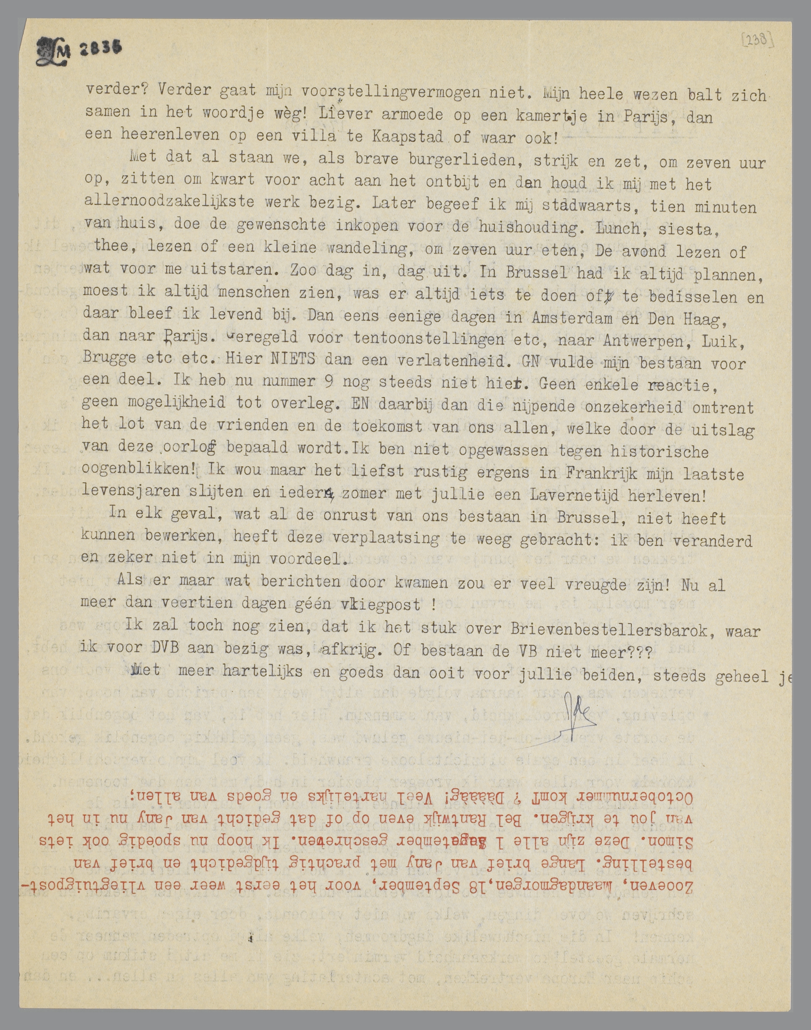 Met dat al staan we, als brave burgerlieden, strijke en zet om zeven uur op, zitten om kwart voor acht aan het ontbijt en dan houd ik mij met het allernoodzakelijkste werk bezig. Later begeef ik mij stadwaarts, tien minuten van huis, doe de gewenschte inkopen voor de huishouding. Lunch, siesta, thee, lezen of een kleine wandeling, om zeven uur eten, De avond lezen of wat voor me uitstaren. Zoo dag in, dag uit. In Brussel had ik altijd plannen, moest ik altijd menschen zien, was er altijd iets te doen of te bedisselen en daar bleef ik levend bij. Dan eens eenige dagen in Amsterdam en Den Haag, dan naar Parijs. Geregeld voor tentoonstellingen etc, naar Antwerpen, Luik, Brugge etc. etc. Hier NIETS dan een verlatenheid. GN vulde mijn bestaan voor een deel. Ik heb nu nummer 9 nog steeds niet hier. Geen enkele reactie, geen mogelijkheid tot overleg. EN dan daarbij die nijpende onzekerheid omtrent het lot van de vrienden en de toekomst van ons allen, welke door de uitslag van deze oorlog bepaald wordt. Ik ben niet opgewassen tegen historische oogenblikken! Ik wou maar het liefst rustig ergens in Frankrijk mijn laatste levensjaren slijten en iederen zomer met jullie een Lavernetijd herleven!