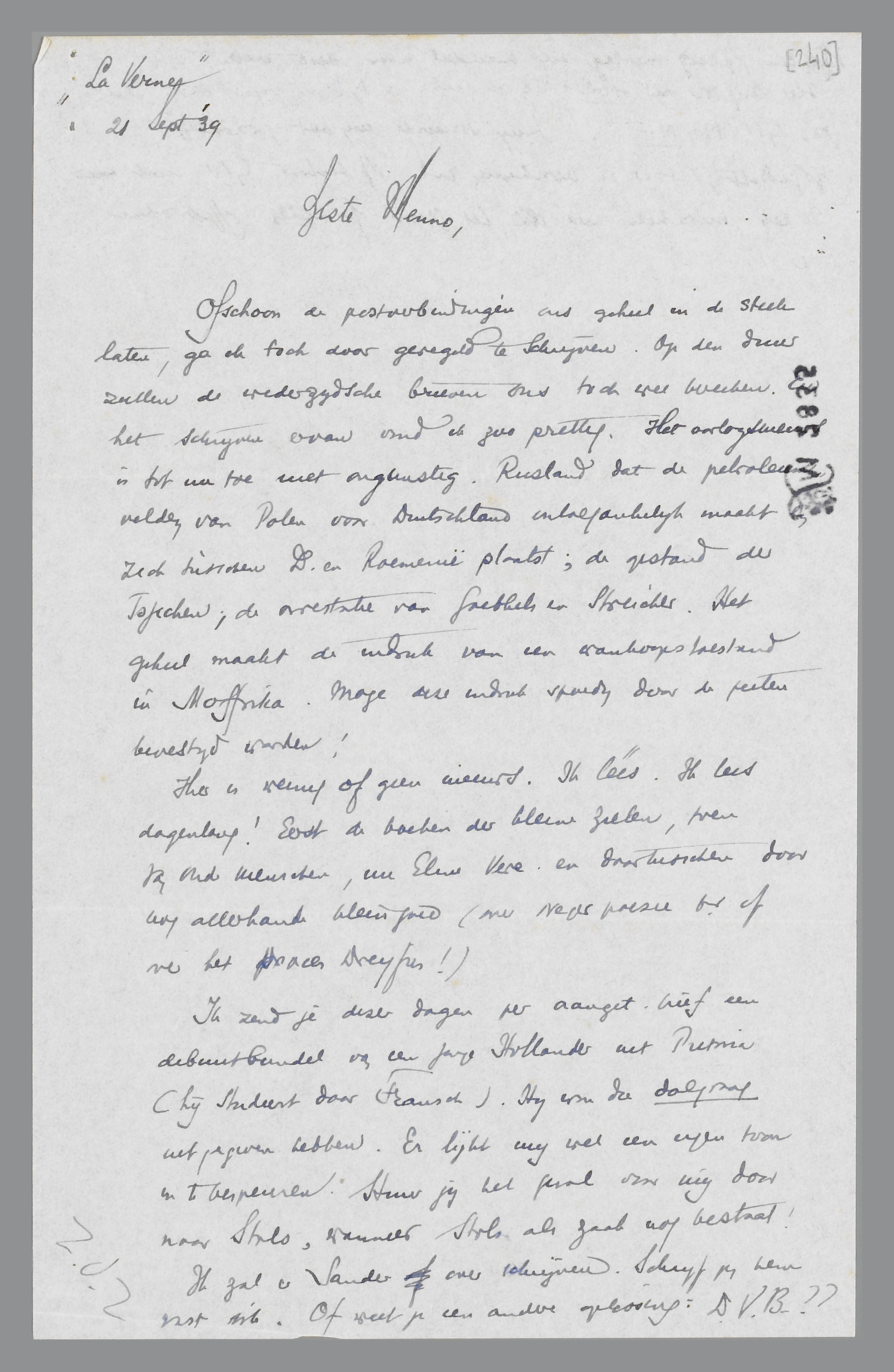 Ofschoon de postverbindingen ons geheel in de steek laten, ga ik toch door geregeld te schrijven. Op den duur zullen de wederzijdsche brieven ons toch wel bereiken. Het schrijven ervan vind ik zoo prettig. Het oorlogsgebeuren is tot nu toe niet ongunstig. Rusland dat de petroleumvelden van Polen voor Duitschland ontoegankelijk maakt. Zich tusschen D. en Roemenie plaatst; de opstand der Tsjechen, de arrestatie van Goebbels en Streicher. Het geheel maakt de indruk van een wanhoopstoestand in Moffrika. Moge die indruk spoedig door de feiten bevestigd worden!