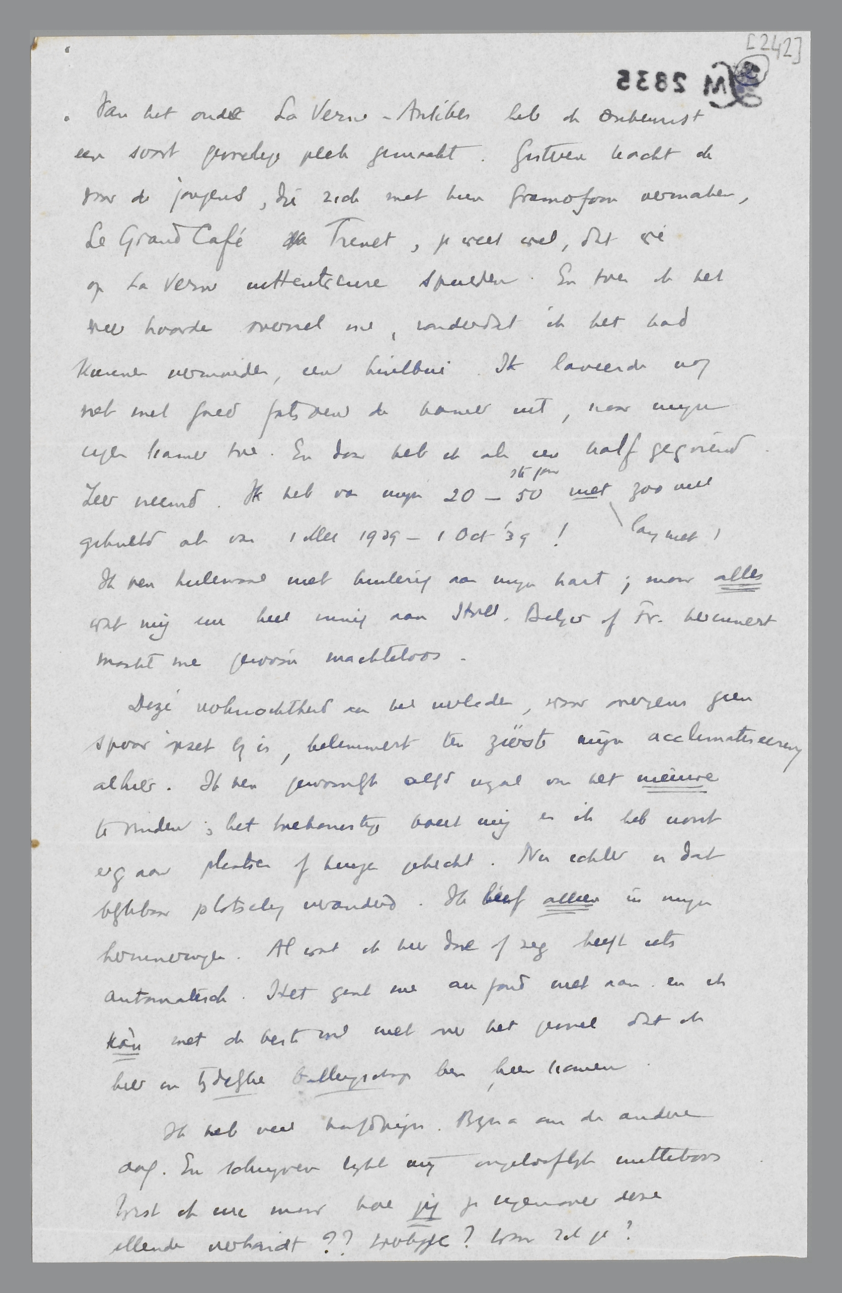 Van het oude La Verne-Antibes heb ik onbewust een soort gevoelige plek gemaakt. Gisteren kocht ik voor de jongens, die zich met hun gramofoon vermaken, Le Grand Café van Trenet, je weet wel, dat ze op La Verne uittentreure speelden. En toen ik het hier hoorde overviel mij, zonder dat ik het had kunnen vermoeden, een huilbui. Ik laveerde nog wel met goed fatsoen de kamer uit, naar mijn eigen kamer toe. En daar heb ik als een kalf gegriend. Zeer vreemd. Ik heb van mijn 20 - 50 ste jaar> niet <lang niet!> zoo veel gehuild als van 1 Mei 1939 - 1 Oct '39!