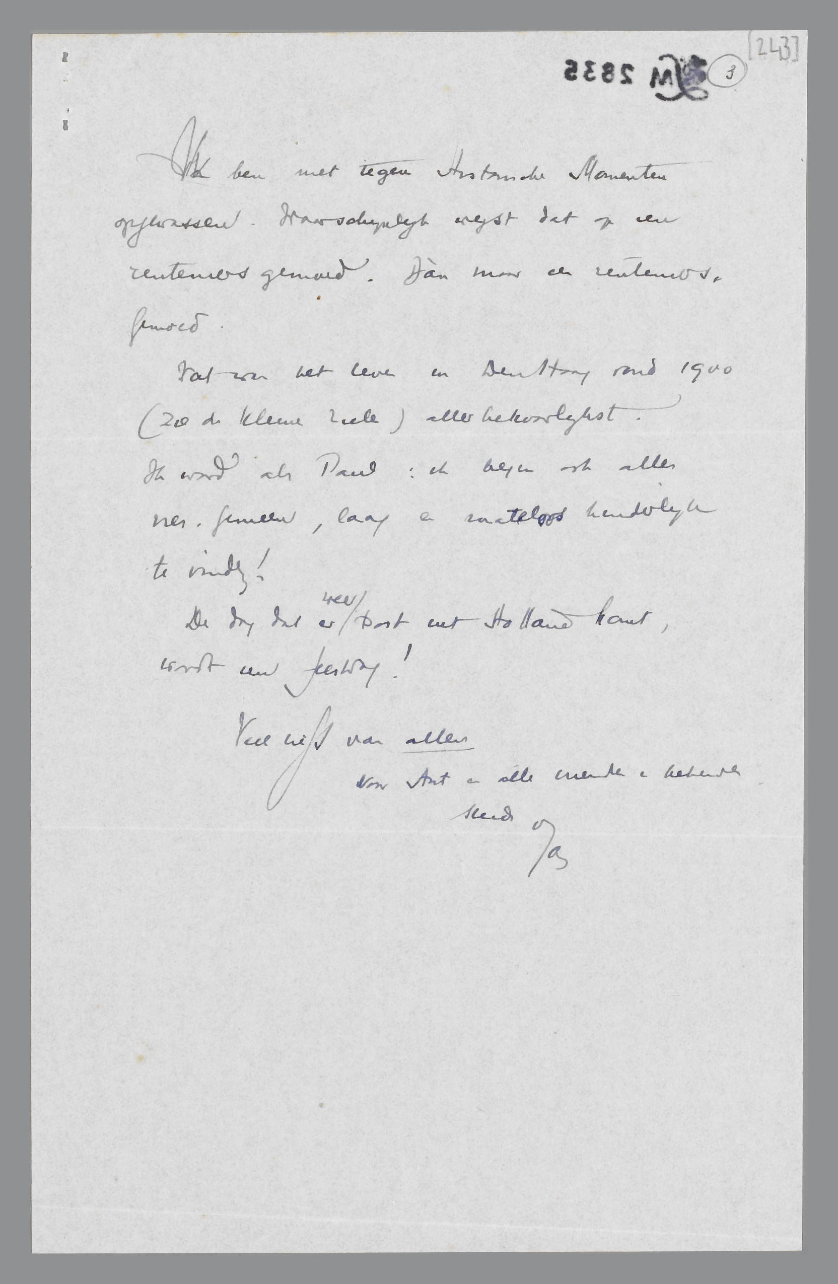 Ik zend je dezer dagen per aangetek. brief een debuutbundel van een jonge Hollander uit Pretoria (hij studeert daar Fransch). Hij wou die dolgraag uitgegeven hebben. Er lijkt mij wel een eigen toon in te bespeuren. Stuur jij het geval voor mij door naar Stols, wanneer Stols als zaak nog bestaat! Ik zal er Sander over schrijven. Schrijf jij hem vast iets. Of weet je een andere oplossing? D.V.B.??