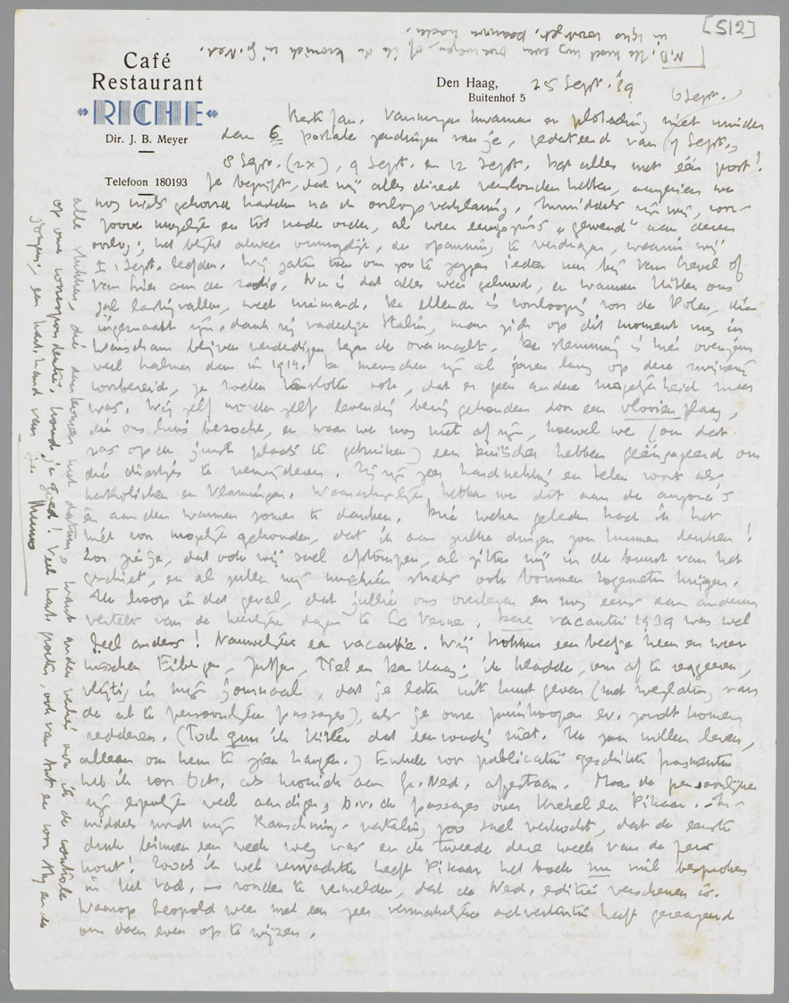 Vanmorgen kwamen er plotseling niet minder dan 6 postale zendingen van je, gedateerd van 6 Sept., 7 Sept., 8 Sept. (2×), 9 Sept. en 12 Sept. Dat alles met één post! Je begrijpt, dat wij alles direct verslonden hebben, aangezien we nog niets gehoord hadden na de oorlogsverklaring. Inmiddels zijn wij, voorzoover mogelijk en tot nader order, al weer eenigszins ‘gewend’ aan dezen oorlog; het blijkt alweer onmogelijk, de spanning te verdragen, waarin wij ± 1 Sept. leefden. Wij zaten toen om zoo te zeggen ieder uur bij Van Crevel of Van Lier aan de radio. Nu is dat alles weer geluwd, en wanneer Hitler ons zal lastigvallen, weet niemand. De ellende is voorloopig voor de Polen, die ingemaakt zijn, dank zij vadertje Stalin, maar zich op dit moment nog in Warschau blijven verdedigen tegen de overmacht. De stemming is hier overigens veel kalmer dan in 1914. De menschen zijn al jaren lang op deze zwijnerij voorbereid, ze voelen tenslotte ook, dat er geen andere mogelijkheid meer was. Wij zelf worden zelf levendig bezig gehouden door een vlooien plaag, die ons huis bezocht, en waar we nog niet af zijn, hoewel we (om dat ras op een juiste plaats te gebruiken) een Duitscher hebben geëngageerd om die diertjes te verwijderen. Zij zijn zeer hardnekkig en telen voort als katholieken en Vlamingen. Waarschijnlijk hebben we dit aan de angora's én aan den warmen zomer te danken. Drie weken geleden had ik het niet voor mogelijk gehouden, dat ik aan zulke dingen zou kunnen denken! Zoo zie je, dat ook wij snel afstompen, al zitten wij in de buurt van het geschiet, en al zullen wij misschien straks ook bommen toegemeten krijgen. Ik hoop in dat geval, dat jullie ons overleven en nog eens aan anderen vertelt van de heerlijke dagen te La Verne. Deze vacantie 1939 was wel heel anders! Nauwelijks een vacantie. Wij trokken een beetje heen en weer tusschen Eibergen, Zutfen, Tiel en Den Haag; ik kladde, om af te reageeren, vlijtig in mijn journaal, dat je later uit kunt geven (met weglating van de al te persoonlijke passages), als je onze puinhoopen ev. zoudt komen redderen. (Toch gun ik Hitler dat eenvoudig niet. Ik zou willen leven, alleen om hem te zien hangen.) Enkele voor publicatie geschikte fragmenten heb ik voor Oct. als kroniek aan Gr. Ned. afgestaan. Maar de persoonlijke zijn eigenlijk veel aardiger, b.v. de passages over Krekel en Pikaar.