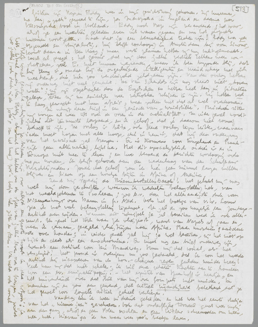 Ik schrijf deze brief in een periode van ‘windstilte’. Misschien zitten wij morgen al weer tot over de ooren in de actualiteit. In ieder geval wordt jullie dit tenminste bespaard, en ik geloof, dat je daarom niet rouwig behoeft te zijn. De oorlog is bête, ook deze oorlog tegen Hitler, waarvan ieder moet hopen met alle hoop, die in hem is, dat hij den ondergang van het nazisme zal brengen. Er is trouwens voor Engeland en Frankrijk geen alternatief, lijkt me. Met dit apocalyptisch ondier is er in Europa niet meer te leven; en hoe beroerd de berichten voorloopig ook mogen worden, ik blijf gelooven aan den nederlaag van den Schuft aus Berchtesgaden. Zonder dat geloof zou ik hier geen minuut langer willen blijven en liever op een houtje bijten in Afrika of Amerika.