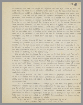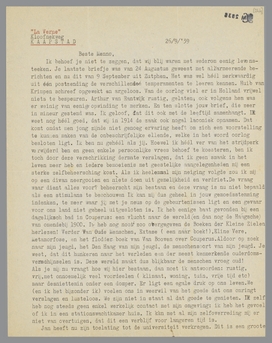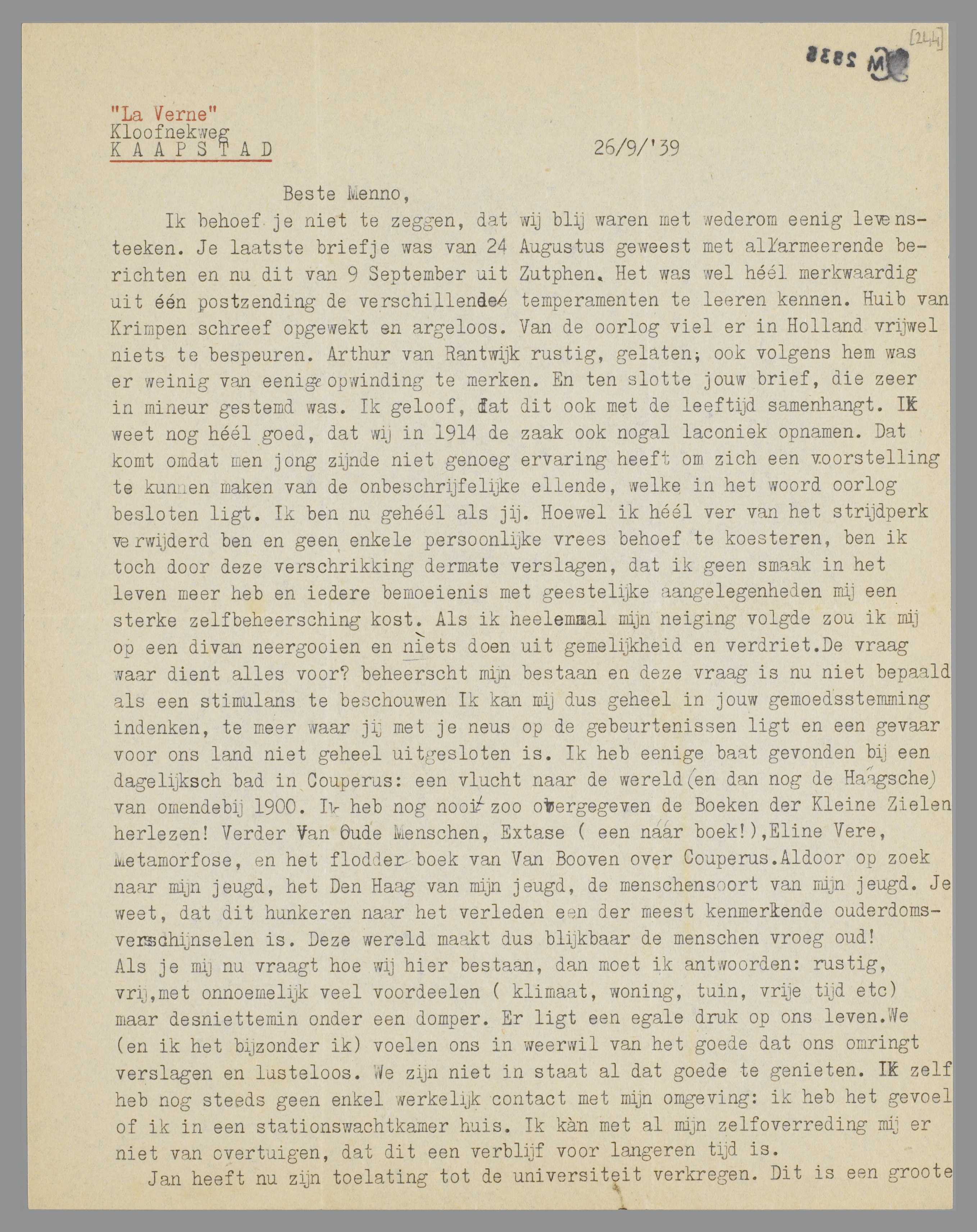 Ik behoef je niet te zeggen, dat wij wederom blij waren met eenig levensteeken. Je laatste briefje was van 24 Augustus geweest met alarmeerende berichten en nu dit van 9 September uit Zutphen. Het was wel héél merkwaardig uit één postzending de verschillende temperamenten te leeren kennen. Huib van Krimpen schreef opgewekt en argeloos. Van de oorlog viel er in Holland vrijwel niets te bespeuren. Arthur van Rantwijk rustig, gelaten; ook volgens hem was er weinig van eenige opwinding te bemerken. En ten slotte jouw brief, die zeer in mineur gestemd was. Ik geloof, dat dit ook met de leeftijd samenhangt. Ik weet nog héél goed, dat wij in 1914 de zaak ook nogal laconiek opnamen. Dat komt omdat men jong zijnde niet genoeg ervaring heeft om zich een voorstelling te kunnen maken van de onbeschrijfelijke ellende, welke in het woord oorlog besloten ligt. Ik ben nu gehéél als jij. Hoewel ik héél ver van het strijdperk verwijderd ben en geen enkele vrees behoef te koesteren, ben ik toch door deze verschrikking dermate verlsagen, dat ik geen smaak in het leven meer heb en iedere bemoeienis met geestelijke aangelegenheden mij een sterke zelfbeheersching kost. Als ik heelemaal mijn neiging volgde zou ik mij op een divan neergooien en nìets doen uit gemelijkheid en verdriet. De vraag waar dient alles voor? Beheerscht mijn bestaan en deze vraag is niet bepaald als een stimulans te beschouwen. Ik kan mij dus geheel in jouw gemoedsstemming indenken, te meer waar jij met je neus op de gebeurtenissen ligt en een gevaar voor ons land niet geheel uitgesloten is. Ik heb eenige baat gevonden bij een dagelijksch bad in Couperus: een vlucht naar de wereld (en dan nog de Haagsche) van omendebij 1900. Ik heb nog nooit zoo overgegeven de Boeken der Kleine Zielen herlezen! Verder Van Oude Menschen, Extase (een naar boek!), Eline Vere, Metamorfoze, en het flodderboek van Van Booven over Couperus. Aldoor op zoek naar mijn jeugd, het Den Haag van mijn jeugd, De menschensoort van mijn jeugd. Je weet, dat dit hunkeren naar het verleden een der meest kenmerkende ouderdomsverschijnselen is. Deze wereld maakt dus blijkbaar de menschen vroeg oud! Als je mij nu vraagt hoe wij hier bestaan, dan moet ik antwoorden: rustig, vrij, met onnoemelijk veel voordelen (klimaat, woning, tuin, vrije tijd etc) maar desniettemin onder een domper. Er ligt een egale druk op ons leven. We (en ik in het bijzonder) voelen ons in weerwil van het goede dat ons omringt verslagen en rusteloos. We zijn niet in staat al dat goede te genieten. Ik zelf heb nog steeds geen werkelijk contact met mijn omgeving: ik heb het gevoel of ik in een stationswachtkamer huis. Ik kàn met al mijn zelfoverreding mij er niet van overtuigen, dat dit een verblijf voor langeren tijd is.