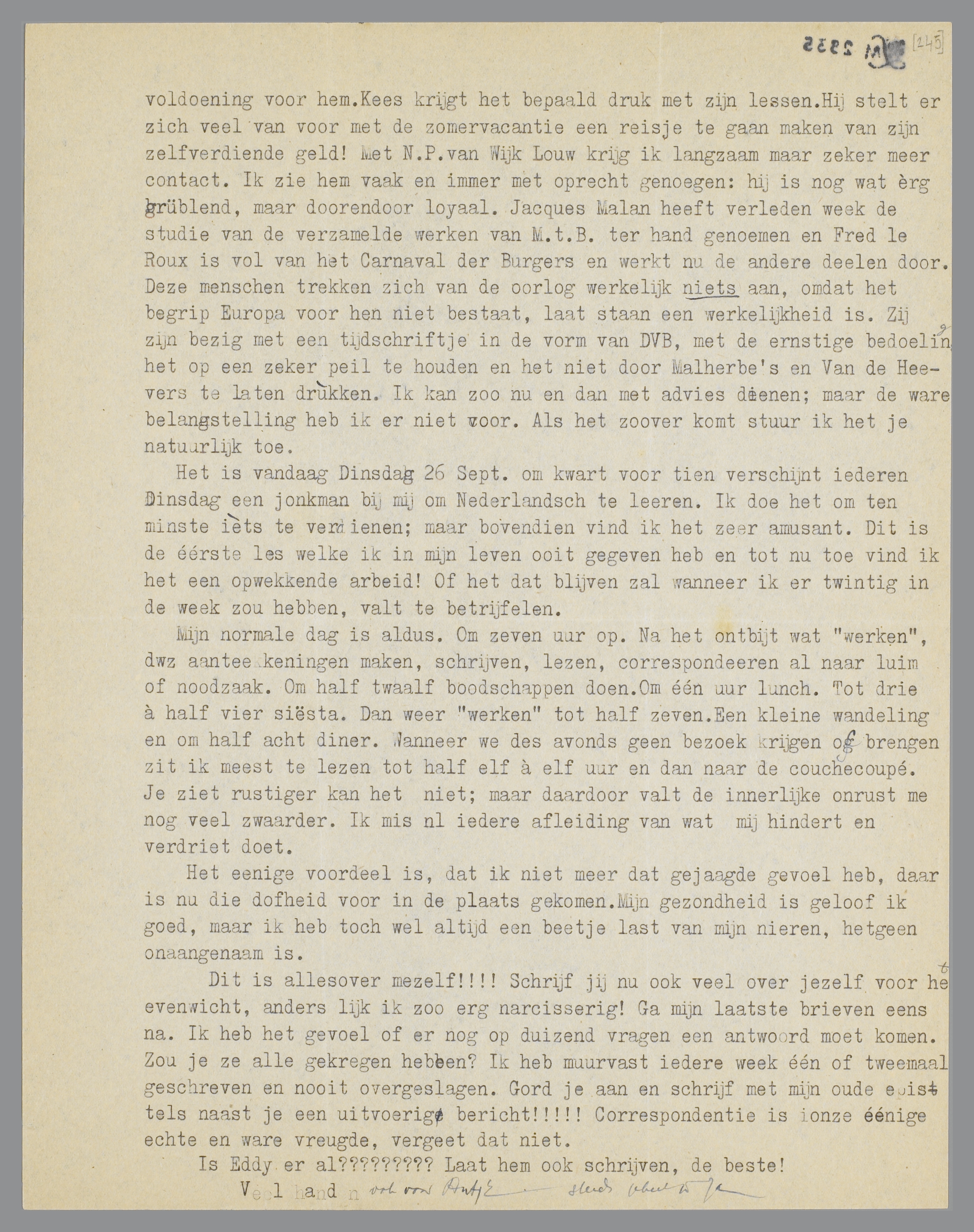 Jan heeft nu zijn toelating aan de universiteit verkregen. Dit is een groote voldoening voor hem. Kees krijgt het bepaald druk met zijn lessen. Hij stelt er zich veel van voor met de zomervacantie een reisje te gaan maken van zijn zelfverdiende geld! Met N.P. Van Wijk Louw krijg ik langzaam maar zeker meer contact. Ik zie hem vaak en immer met oprecht genoegen: hij is nog wat èrg grüblend, maar doorendoor loyaal. Jacques Malan heeft verleden week de studie van de verzamelde werken van M.t.B. ter hand genomen en Fred le Roux is vol van het Carnaval der Burgers en werkt nu de andere deelen door. Deze menschen trekken zich van de oorlog werkelijk niets aan, omdat het begrip Europa voor hen niet bestaat, laat staan een werkelijkheid is. Zij zijn bezig met een tijdschriftje in de vorm van DVB, met de ernstige bedoeling het op zeker peil te houden en het niet door Malherbe's en Van de Heevers te laten drùkken. Ik kan zoo nu en dan met advies dienen: maar de ware belangstelling heb ik er niet voor. Als het zoover komt stuur ik het je natuurlijk toe.