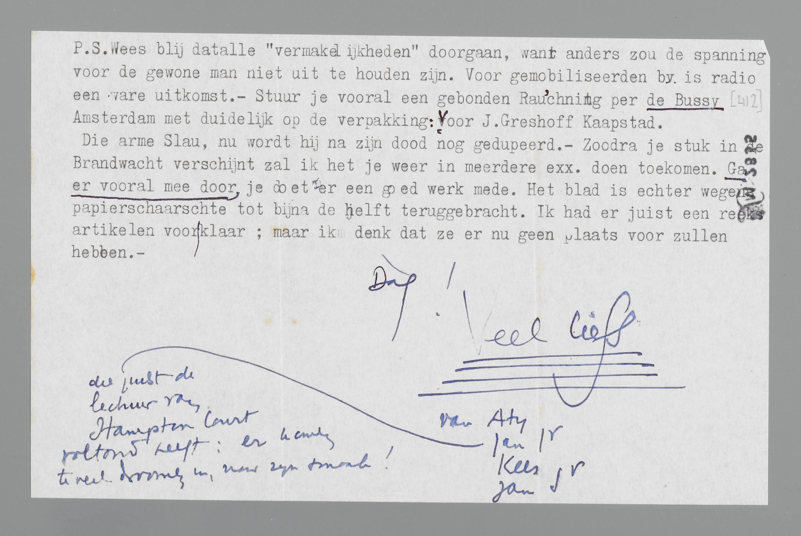 Zoodra je stuk in Brandwacht verschijnt zal ik het je weer in meerdere exx. doen toekomen. Ga er vooral mee door je doet er een goed werk mede. Het blad is echter wegens papierschaarste tot bijna de helft teruggebracht. Ik had er juist een reeks artikelen voor klaar; maar ik denk dat ze er nu geen plaats voor zullen hebben.