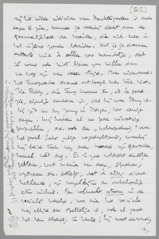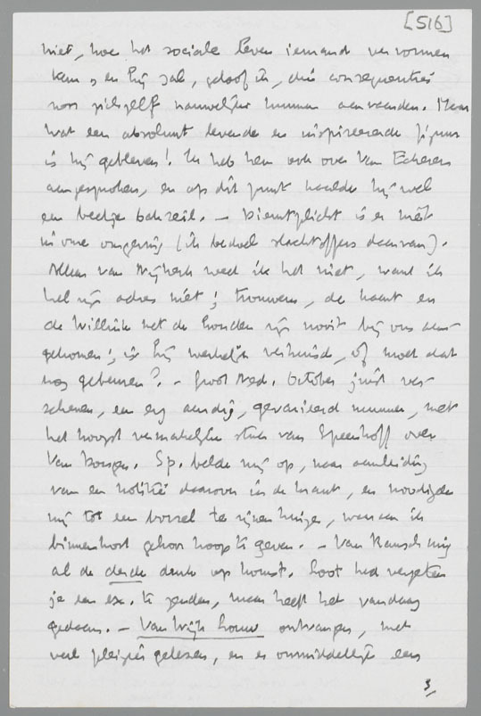Ik merk met verdriet, dat de ballingschap je nog steeds niet bevalt, en dat je zelfs een oorlogvoerend Europa niet zonder welgevallen zoudt terugzien. Ik kan mij al deze gevoelens zoo goed begrijpen, dat ik me er alleen over verbaas, dat ze bij jou zoo sterk optreden - hoewel ik het in stilte toch wel eens vermoed had. De ‘gezamenlijkheid’ kan een zeer groote troost zijn; ik heb het gemerkt tijdens die eerste Septemberdagen, toen mijn heele dag gevuld was met bezoeken aan en van Van Crevel of Van Lier. Zelfs de mogelijkheid van een absurden ondergang dank zij het wilde individu van Berchtesgaden is onder oogen te zien, wanneer je daarbij denkt aan de gezamenlijkheid der vrienden die zich mee in het inferno zouden bevinden. Dat je je daaraan onttrok vind ik alleen zoo menschelijk, dat ik soms ook niets liever zou willen dan ver weg zijn van dezen strijd. Maar inderdaad: het Europeesche drama ontloopt men toch niet. Zie Eddy, die terug kwam en, als ik goed zie, eigenlijk dankbaar is, dat hij weer terug is. Hij zit nu bij Jany in Bergen, voor eenige dagen. Wij hadden al een paar uitvoerige gesprekken, o.a. ook een ‘nabespreking’ over het geval Saks zaliger nagedachtenis, waarbij wij beide toch nog even kwaad zijn geworden, hoewel niet erg. E. is zoo volstrekt dezelfde gebleven, wat manier van doen, spreken, optreden etc. betreft, dat ik alles direct herkende, zijn nagelbijten en onbehoorlijk eten incluis. Een volmaakt atoom in de sociale wereld, voor wien het sociale nog altijd een spelletje is, ook al gaat het hem bloedig ter harte; hij weet eenvoudig niet, hoe het sociale leven iemand vervormen kan, en hij zal, geloof ik, die consequenties voor zichzelf nauwelijks kunnen aanvaarden. Maar wat een absoluut levende en inspireerende figuur is hij gebleven! Ik heb hem ook over Van Eckeren aangesproken, en op dit punt haalde hij wel een beetje bakzeil.