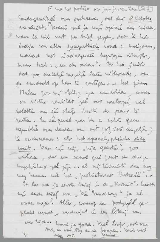 Het plan Malan zou mij stellig zeer aanlokken, maar de bittere realiteit zal ons voorlopig wel beletten om één stap buiten de grens te zetten. In één geval zou ik er echter geen oogenblik over denken om dit (of iets dergelijks) te ondernemen: als het apocalyptische dier wint. Dan zijn wij, ‘vrije geesten’, zoo verloren, dat een sauve qui peut de eenige mogelijkheid zal zijn... als wij tenminste dan nog weg kunnen uit het ‘protectoraat Batavië’.