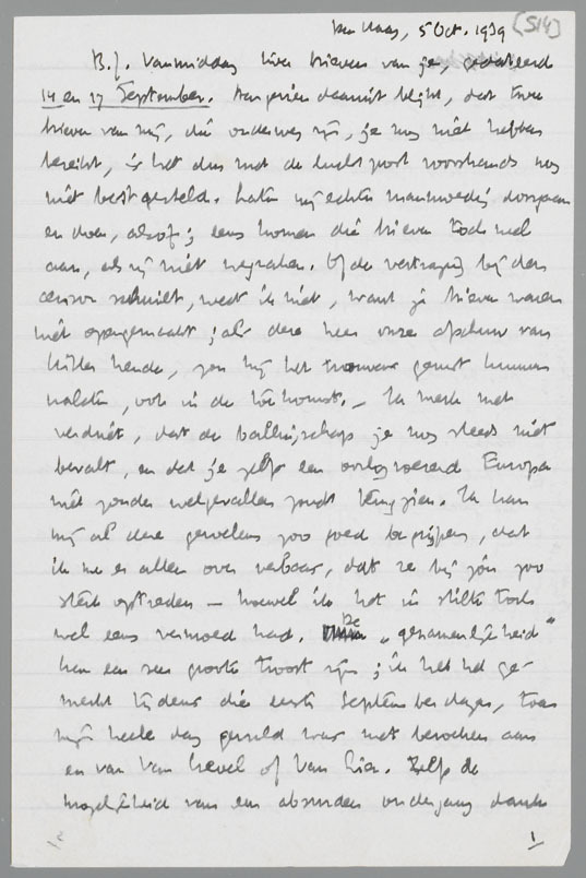 Vanmiddag twee brieven van je, gedateerd 14 en 17 September. Aangezien daaruit blijkt, dat twee brieven van mij, die onderweg zijn, je nog niet hebben bereikt, is het dus met de luchtpost voorshands nog niet best gesteld. Laten wij echter manmoedig doorgaan en doen, alsof; eens komen die brieven toch wel aan, als zij niet wegraken. Of de vertraging bij den censor schuilt, weet ik niet, want je brieven waren niet opengemaakt; als deze heer onze afschuw van Hitler kende, zou hij het trouwens gerust kunnen nalaten, ook in de toekomst.
