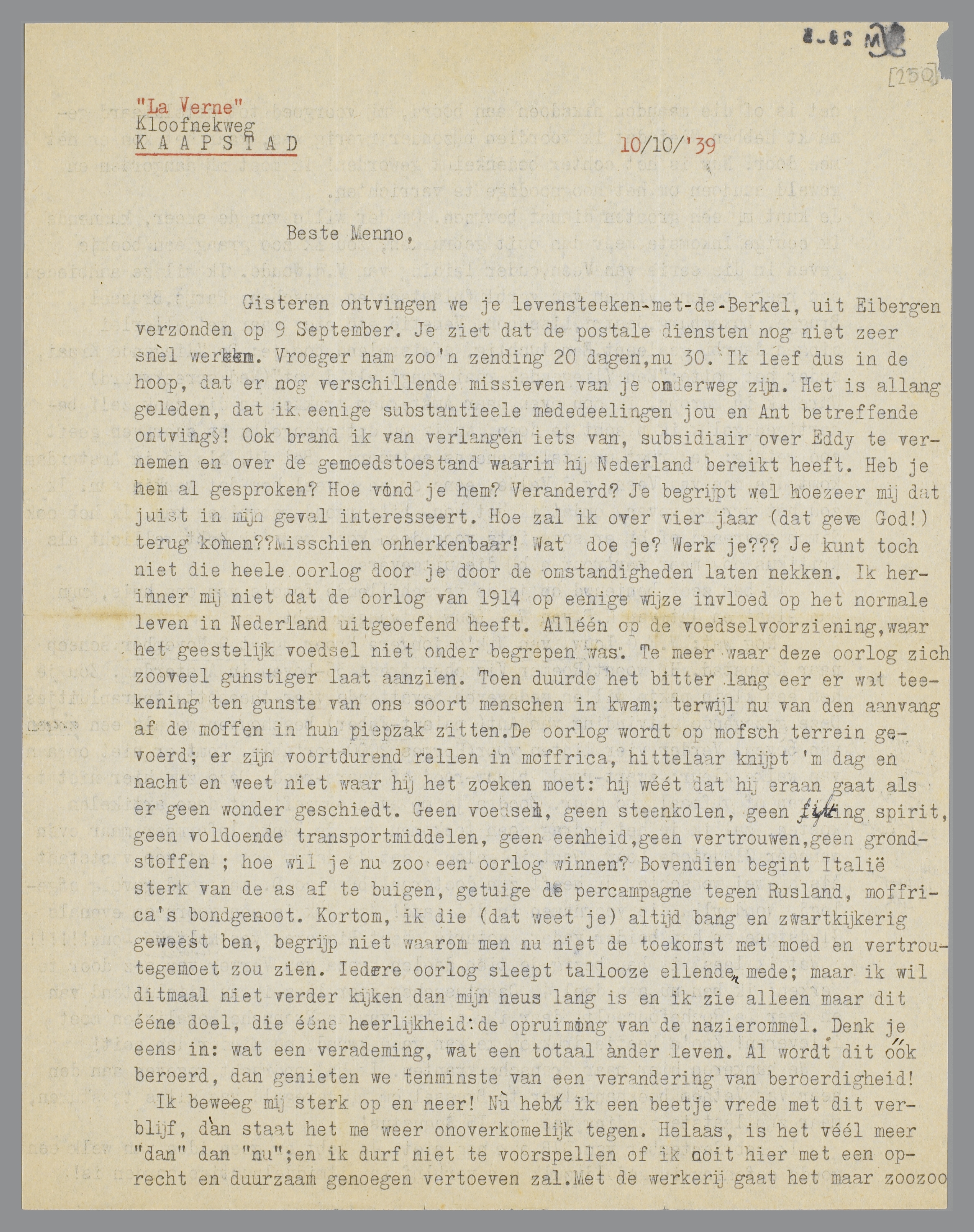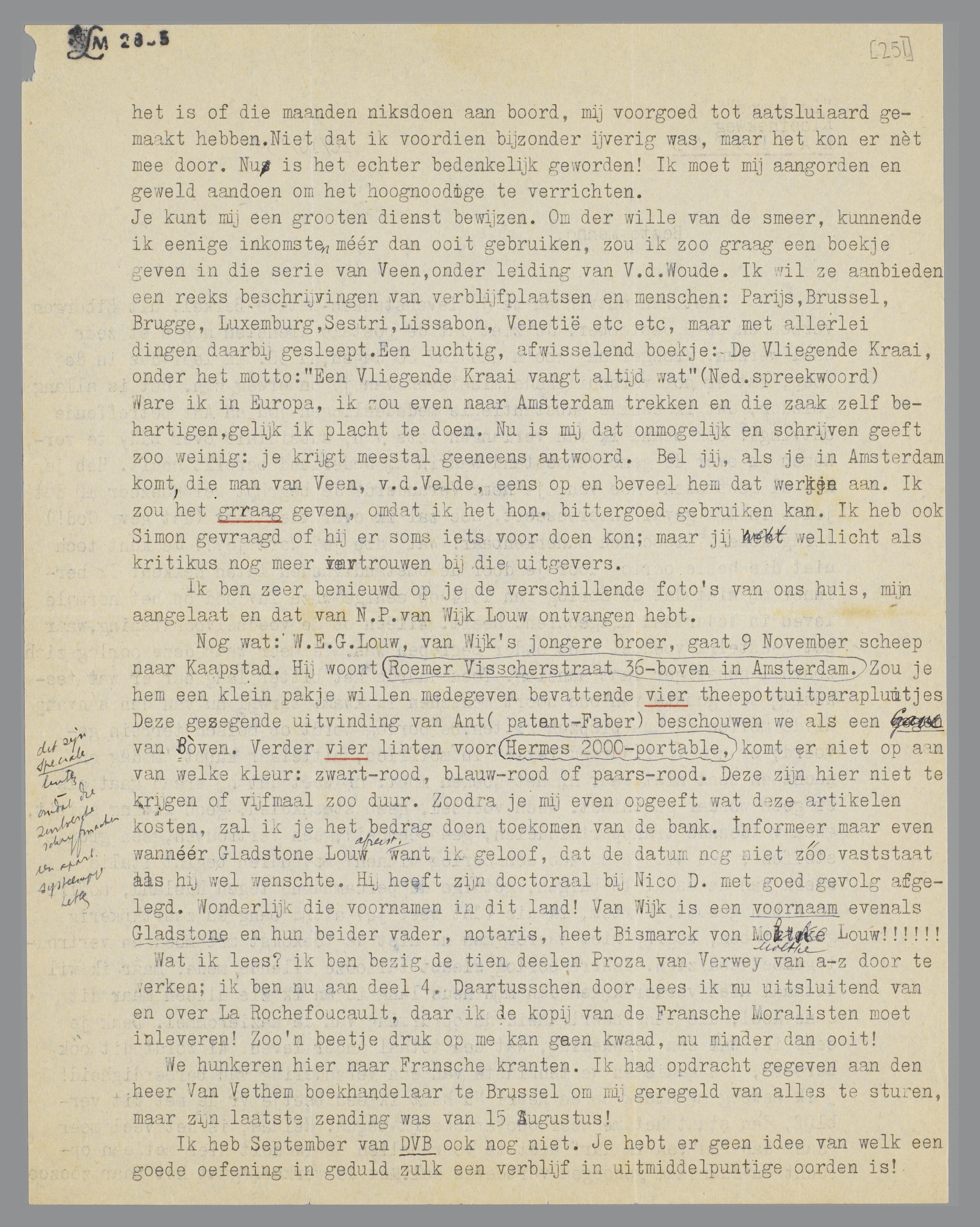 Nog wat: W.E.G.Louw, van Wijk's jongere broer, gaat 9 November scheep naar Kaapstad. Hij woont Roemer Visscherstraat 36-boven in Amsterdam. Zou je hem een klein pakje willen medegeven bevattende vier theepottuitparapluutjes. Deze gezegende uitvinding van Ant (patent-Faber) beschouwen we als een Gave van Bòven. Verder vier linten voor Hermes 2000-portable, <Dit zijn speciale linten - omdat die Zwitserse schrijfmachines een apart systeempje hebben> komt er niet op aan van welke kleur: zwart-rood, blauw-rood of paars-rood. Deze zijn hier niet te krijgen of vijfmaal zoo duur. Zoodra je mij even opgeeft wat deze artikelen kosten, zal ik je een bedrag doen toekomen van de bank. Informeer maar even wannéér Gladstone Louw <afreist> want ik geloof, dat de datum nog niet zóó vaststaat als hij wel wenschte. Hij heeft zijn doctoraal bij Nico D. met goed gevolg afgelegd. Wonderlijk die voornamen in dit land! Van Wijk is een voornaam evenals Gladstone en hun beider vader, notaris, heet Bismarck von Molthe Louw!!!!!!