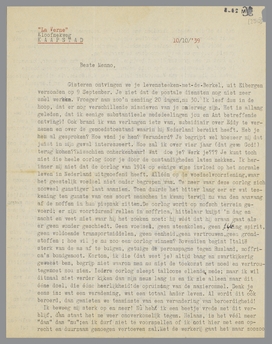 Gisteren ontvingen we je levensteeken-met-de-Berkel, uit Eibergen verzonden op 9 September. Je ziet dat de postale diensten nog niet zeer snèl werken. Vroeger nam zoo'n zending 20 dagen, nu 30. Ik leef dus in de hoop, dat er verschillende missieven van je onderweg zijn. Het is allang geleden, dat ik eenige substantieele mededeling jou en Ant betreffende ontving! Ook brand ik van verlangen iets van, subsidiair over Eddy te vernemen en over de gemoedstoestand waarin hij Nederland bereikt heeft. Heb je hem al gesproken? Hoe vond je hem? Veranderd? Je begrijpt wel hoezeer mij dat juist in mijn geval interesseert. Hoe zal ik over vier jaar (dat geve God!) terug komen?? Misschien onherkenbaar! Wat doe je? Werk je??? Je kunt toch niet die heele oorlog door je door die omstandigheden laten nekken? Ik herinner mij niet dat de oorlog in 1914 op eenige wijze inlvoed op het normale leven in Nederland uitgeoefend heeft. Alléén op de voedselvoorziening, waar het geestelijk voedsel niet onder begrepen was. Te meer waar deze oorlog zich zooveel gunstiger laat aanzien. Toen duurde het bitter lang eer er wat teekening ten gunste van ons soort menschen in kwam; terwijl nu van den aanvang af de moffen in hun piepzak zitten. De oorlog wordt op mofsch terrein gevoerd; er zijn voortdurend rellen in moffrica, hittelaar knijpt 'm dag en nacht en weet niet waar hij het zoeken moet: hij wéét dat hij eraan gaat als er geen wonder geschiedt. Geen voedsel, geen steenkolen, geen fighting spirit, geen voldoende transportmiddelen, geen eenheid, geen vertrouwen, geen grondstoffen; hoe wil je nu zoo een oorlog winnen? Bovendien begint Italië sterk van de as af te buigen, getuige de percampagne tegen Rusland, moffrica's bondgenoot. Kortom, ik die (dat weet je) altijd bang en zwartkijkerig geweest ben, begrijp niet waarom men nu niet de toekomst met moed en vertrouwen tegemoet zou zien. Iedere oorlog sleept tallooze ellende mede; maar ik wil ditmaal niet verder kijken dan mijn neus lang is en ik zie alleen maar dit ééne doel, die ééne heerlijkheid: de opruiming van de nazierommel. Denk je eens in: wat een verademing, wat een totaal ànder leven. Al wordt dit óók beroerd, dan genieten we tenminste van een verandering van beroerdigheid!
