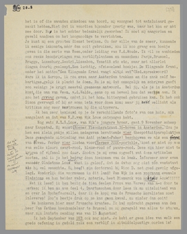Je kunt mij een grooten dienst bewijzen. Om der wille van de smeer, kunnende ik eenige inkomsten méér dan ooit gebruiken, zou ik zoo graag een boekje geven in die serie van Veen, onder leiding van V.d.Woude. Ik wil ze aanbieden een reeks beschrijvingen van verblijfplaatsen en menschen: Parijs, Brussel, Brugge, Luxemburg, Sestri, Lissabon, Venetië etc etc, maar met allerlei dingen daarbij gesleept. Een luchtig, afwisselend boekje: De Vliegende Kraai, onder het mooto: ‘Een vliegende kraai vangt altijd wat’ (Ned. spreekwoord). Ware ik in Europa, ik zou even naar Amsterdam trekken en die zaak zelf behartigen, gelijk ik placht te doen. Nu is mij dat onmogelijk en schrijven geeft zoo weinig: je krijgt meestal geeneens antwoord. Bel jij, als je in Amsterdam komt, die man van Veen, v.d. Velde, eens op, en beveel hem dat werkje aan. Ik zou het grraag geven, omdat ik het hon. bittergoed gebruiken kan. Ik heb ook Simon gevraagd of hij er soms iets voor kon doen; maar jij hebt wellicht als kritikus nog meer vertrouwen bij die uitgevers.